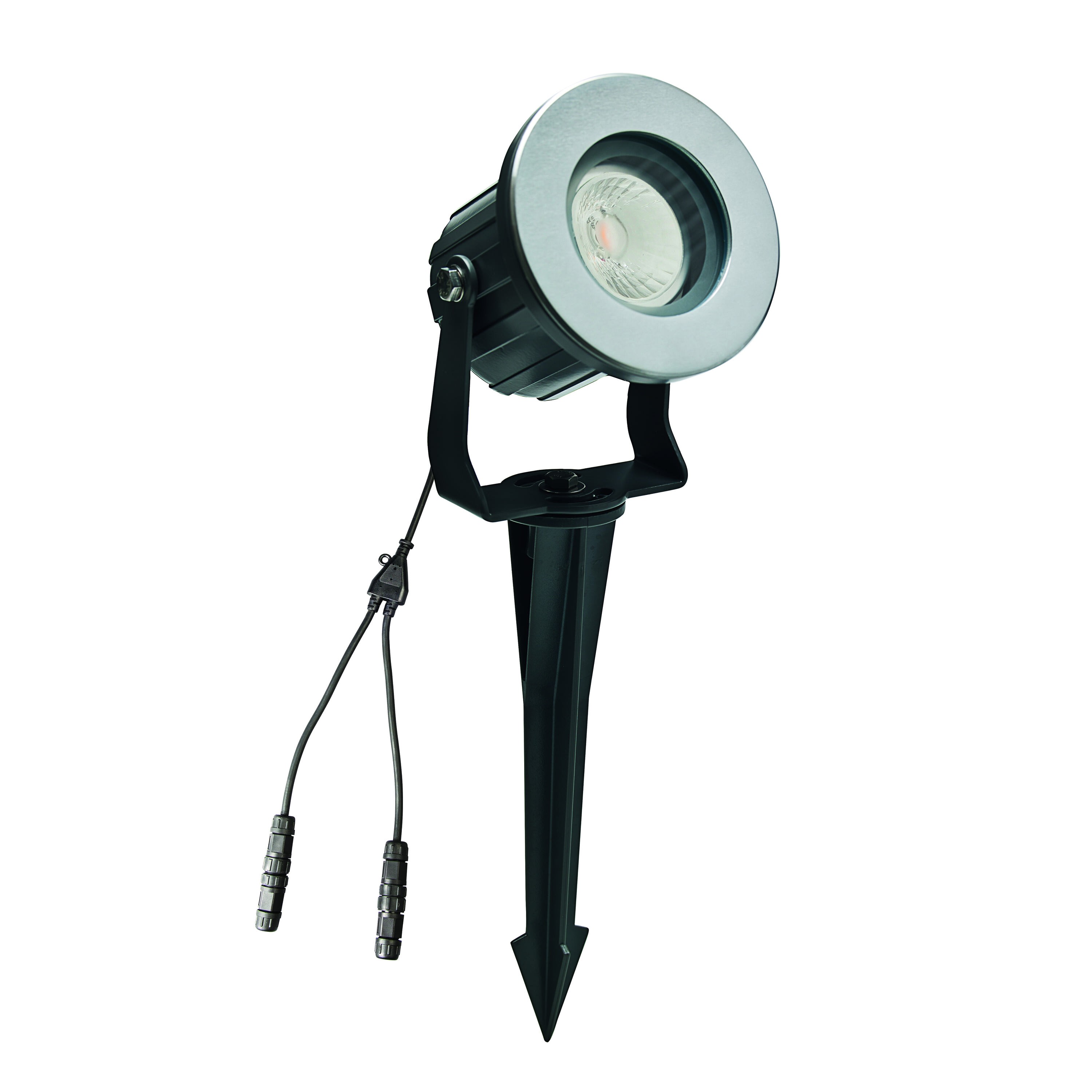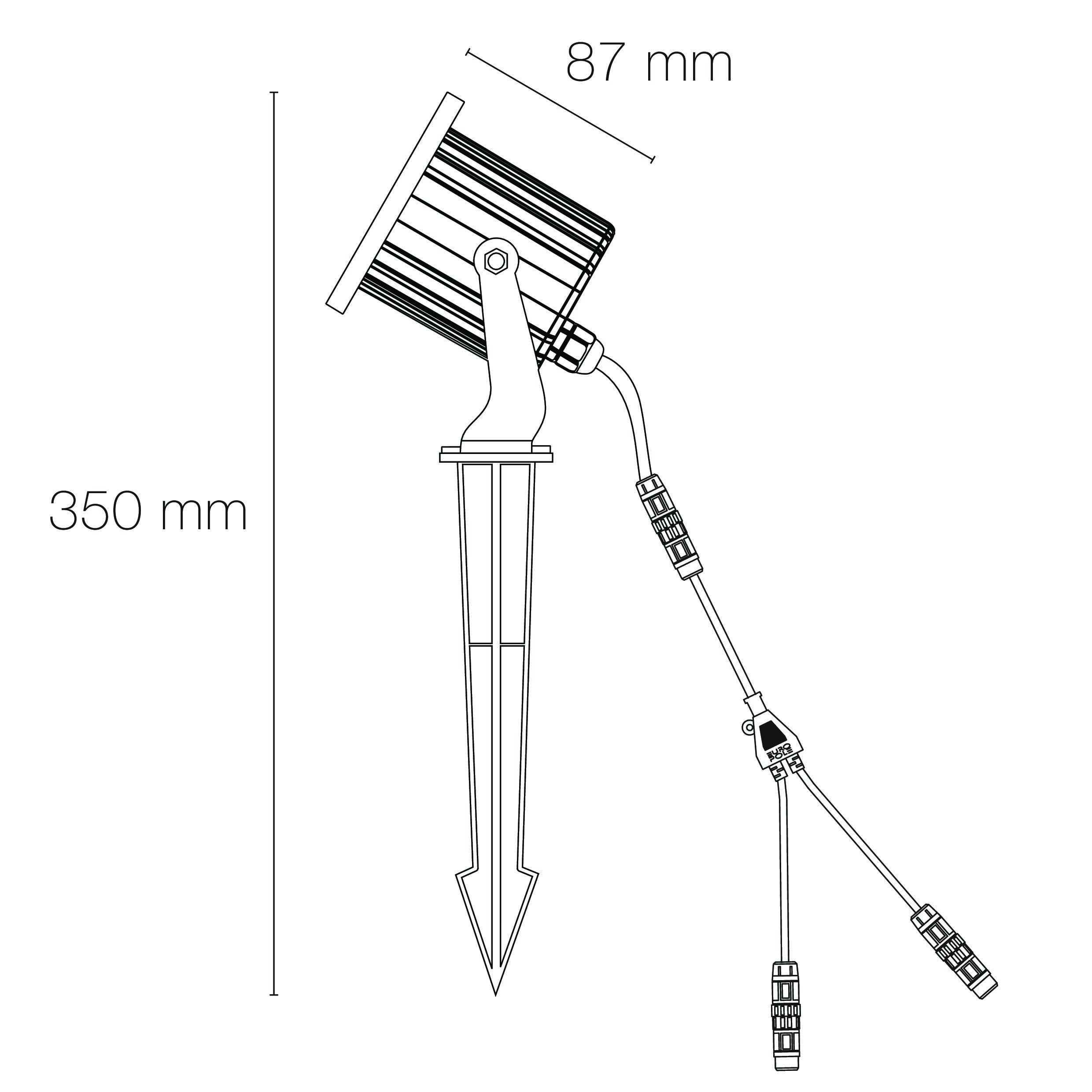 Projecteur EUROPOLE YAH LED EVO - piquet noir, rotatif et orientable, blanc 4000K, IRC90, 6W, 550lm (91,67lm/W), verre transparent 38°, 230VAC. Classe de protection I, IP65, IK04, câblé de 1m avec connectiques rapides IP68 Plug & Play mâle et femelle, HO5RN-F 3x1mm². Durée de vie : 20000h. Dimmable : Oui, variation TRIAC. Matériau : corps en aluminium/collerette en inox 316L. Traitement de la surface : corps traité anticorrosion. Températures de fonctionnement : -20°C/+40°C. Submersible : Non. Mode de pose/installation : sur piquet.