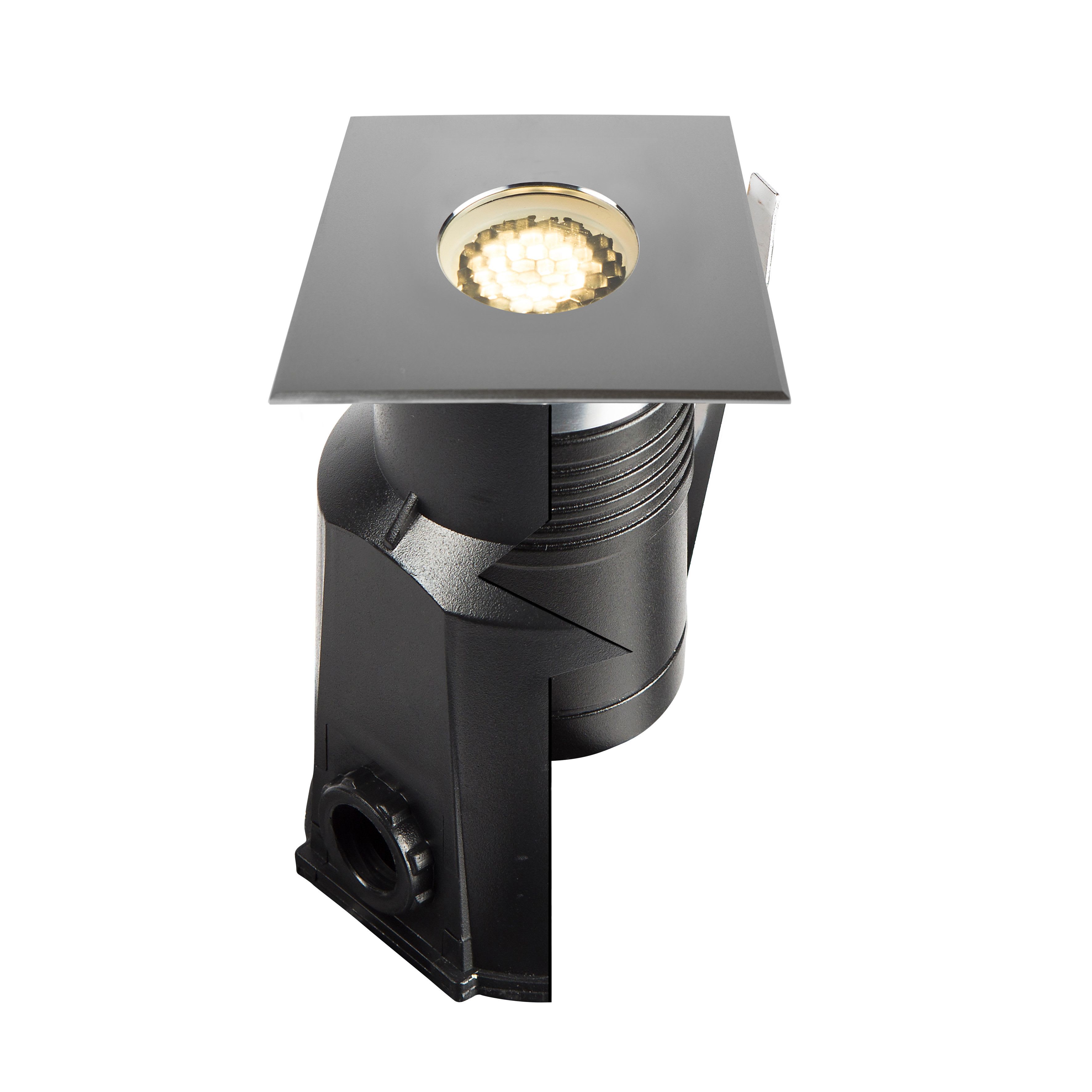 Encastré de sol EUROPOLE ZEPH 1 - 24 carré inox, blanc 3000K, IRC>80, 2W, 132lm (66lm/W), verre transparent/nid d'abeille basse luminance, angle 30° (éclairage), 24VDC. Classe de protection III, IP67, IK08, câblé de 0,5m avec connectiques rapides IP68 Plug & Play mâle et femelle, HO5RN-F 2x1mm². Durée de vie : 30000h. Dimmable : Non. Dimension collerette : 70x70mm. Diamètre d'encastrement : 55mm. Matériau : corps en aluminium/collerette et visserie inox 316L. Traitement de la surface : traitement de la collerette par passivation, corps traité anticorrosion. Résistance environnement : garantie corrosion 15 ans. Températures de fonctionnement : -20°C/+40°C. Walkover : Oui. Driveover : 1500Kg avec pot d'encastrement. Submersible : Non. Diamètre d'encastrement indiqué pour installation sans pot d'encastrement.
