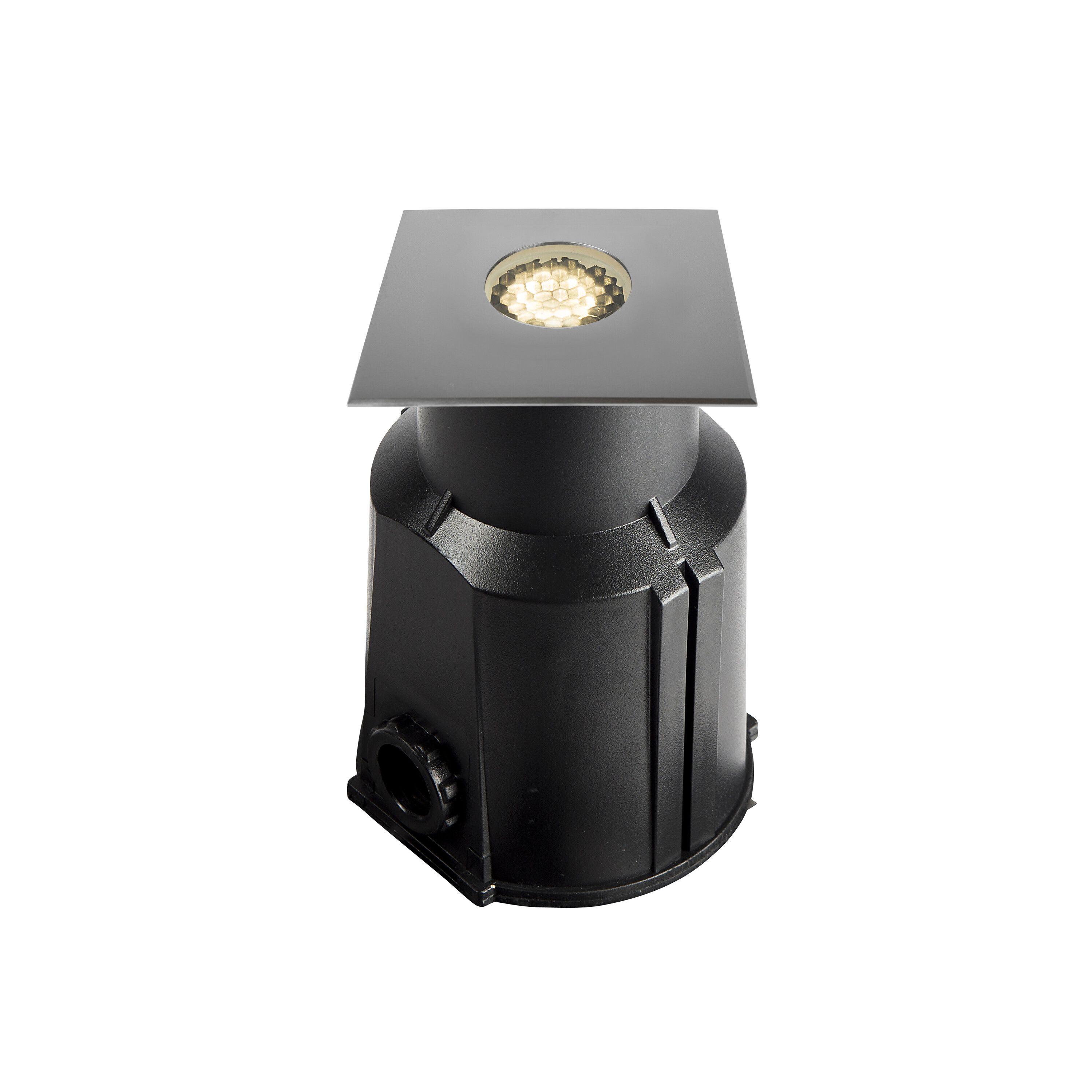 Encastré de sol ZEPH 1 - 24 carré : 70x70mm, inox, blanc 3000K, IRC>80, 2W, 132lm (66lm/W), verre transparent/nid d'abeille basse luminance, 30° (éclairage), 24VDC. Classe III, IP67. IK08. Non dimmable