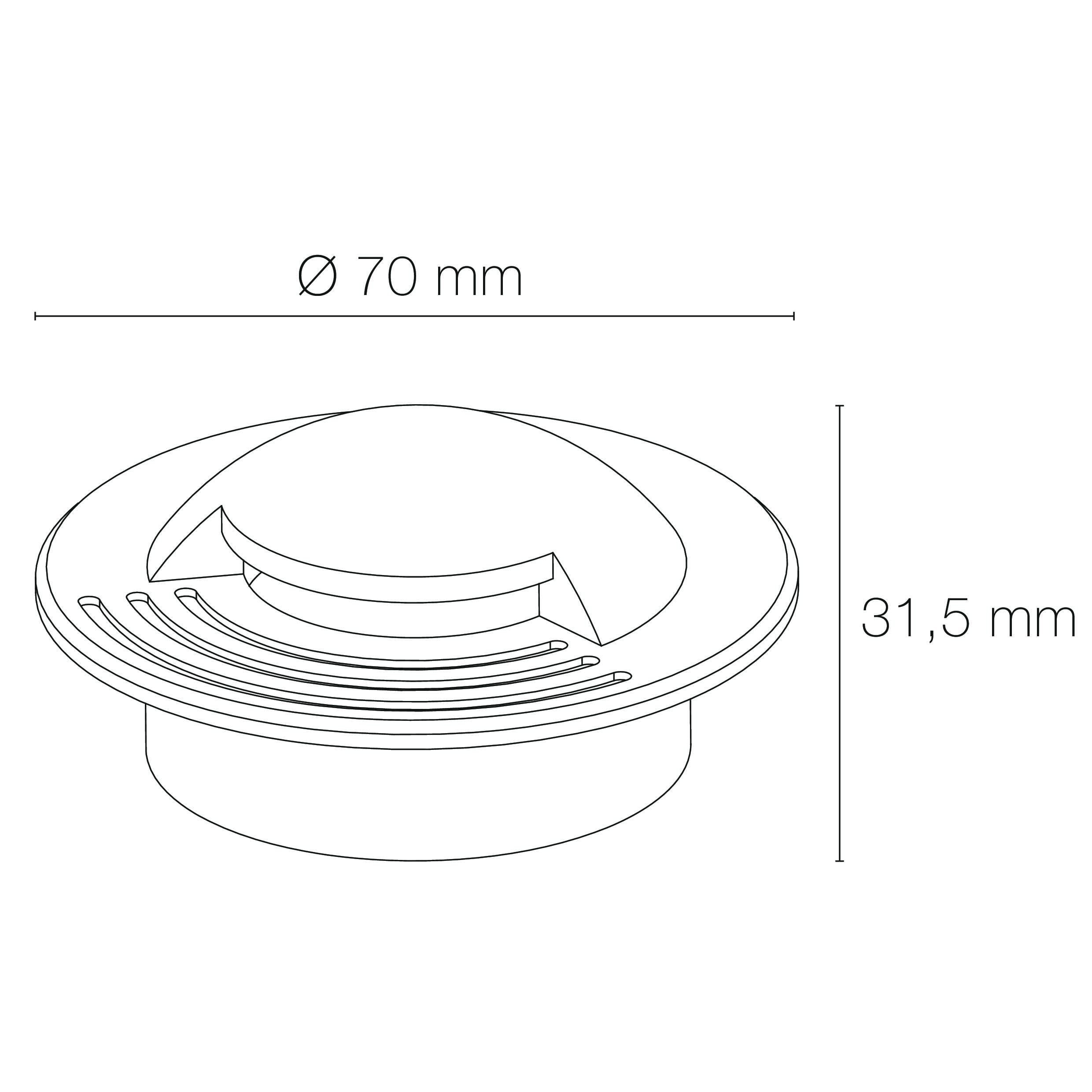 Encastré de sol EUROPOLE ZEPH 1 SLIM - 230 déflecteur simple inox, collerette percée, bleu 2W, verre transparent/nid d'abeille basse luminance, 230VAC. Classe de protection I, IP67, IK08, câblé de 0,5m avec connectiques rapides IP68 Plug & Play mâle et femelle, HO5RN-F 3x1mm². Durée de vie : 30000h. Dimmable : Non. Dimension collerette : diamètre 70mm. Diamètre d'encastrement : 55mm. Matériau : corps en aluminium/collerette et visserie inox 316L. Traitement de la surface : traitement de la collerette par passivation, corps traité anticorrosion. Résistance environnement : peinture résistante aux brouillards salins 1000h. Températures de fonctionnement : -20°C/+40°C. Walkover : Oui. Driveover : Non. Submersible : Non. Installation uniquement en encastré dans terrasse ventilée. Alimentation déportée incluse.
