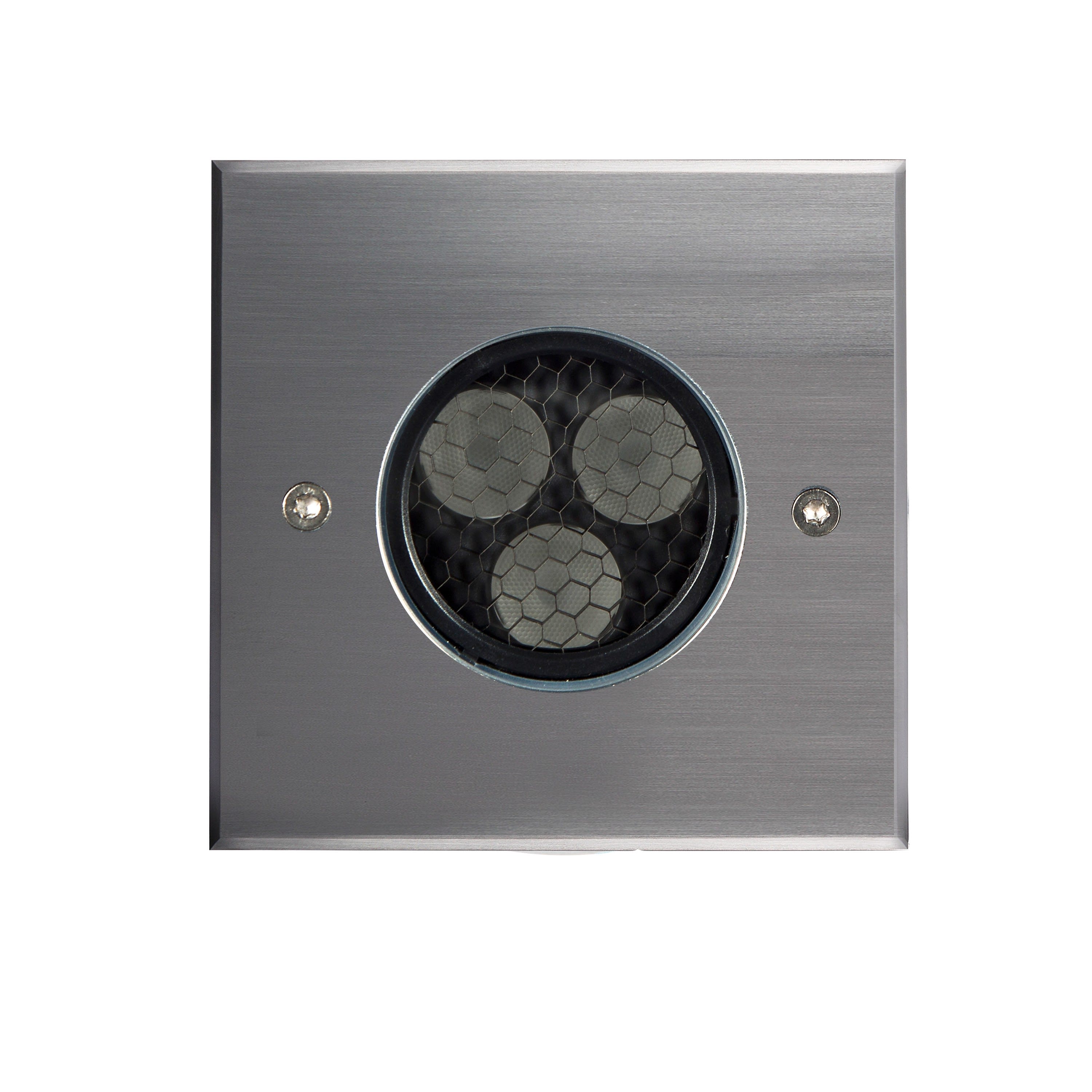 Encastré de sol ZEPH 2 - 24 carré : 116x116mm, inox, RGBW 6500K3x2W, verre transparent, 0/50° (éclairage), 24VDC. Classe III, IP67. IK08. Dimmable.
