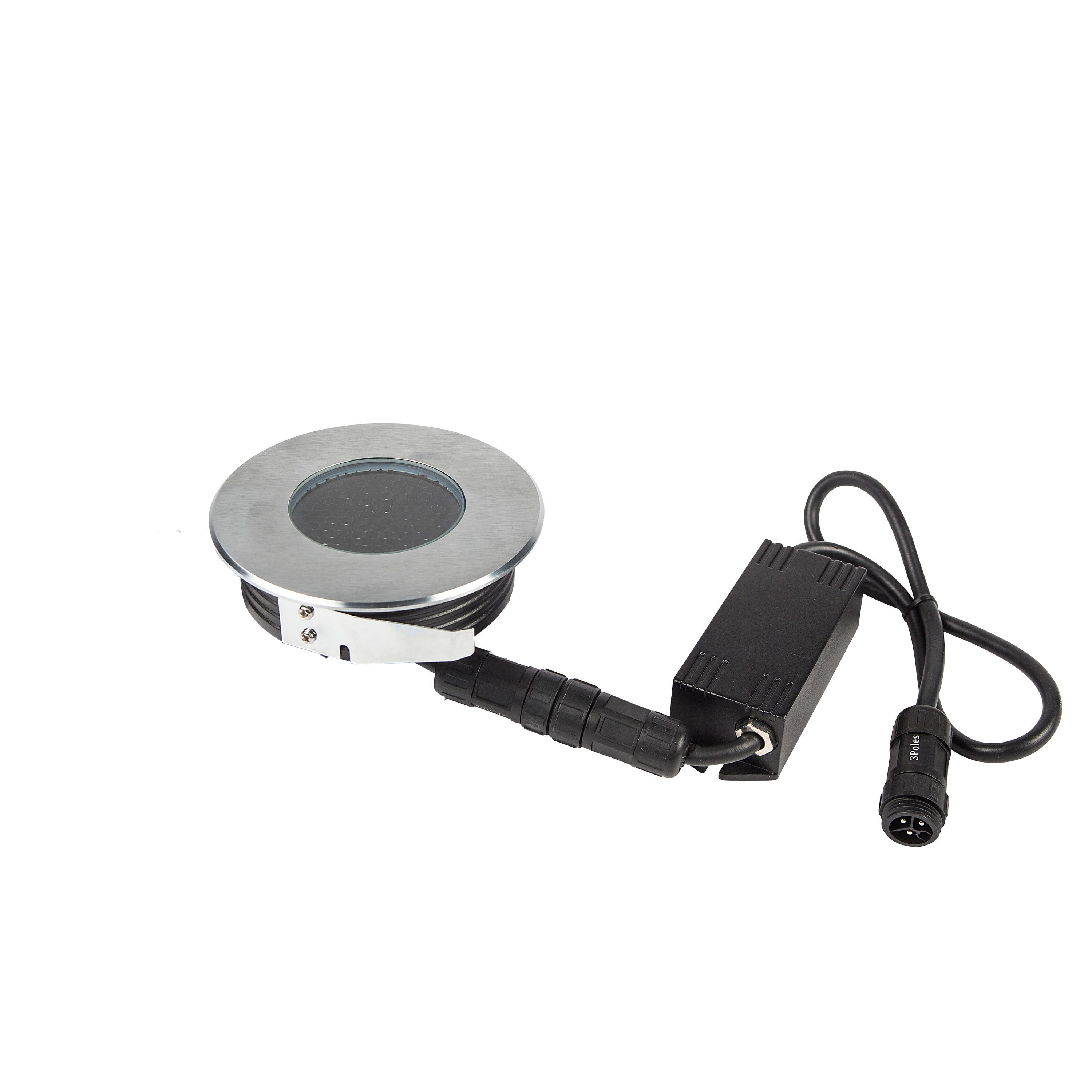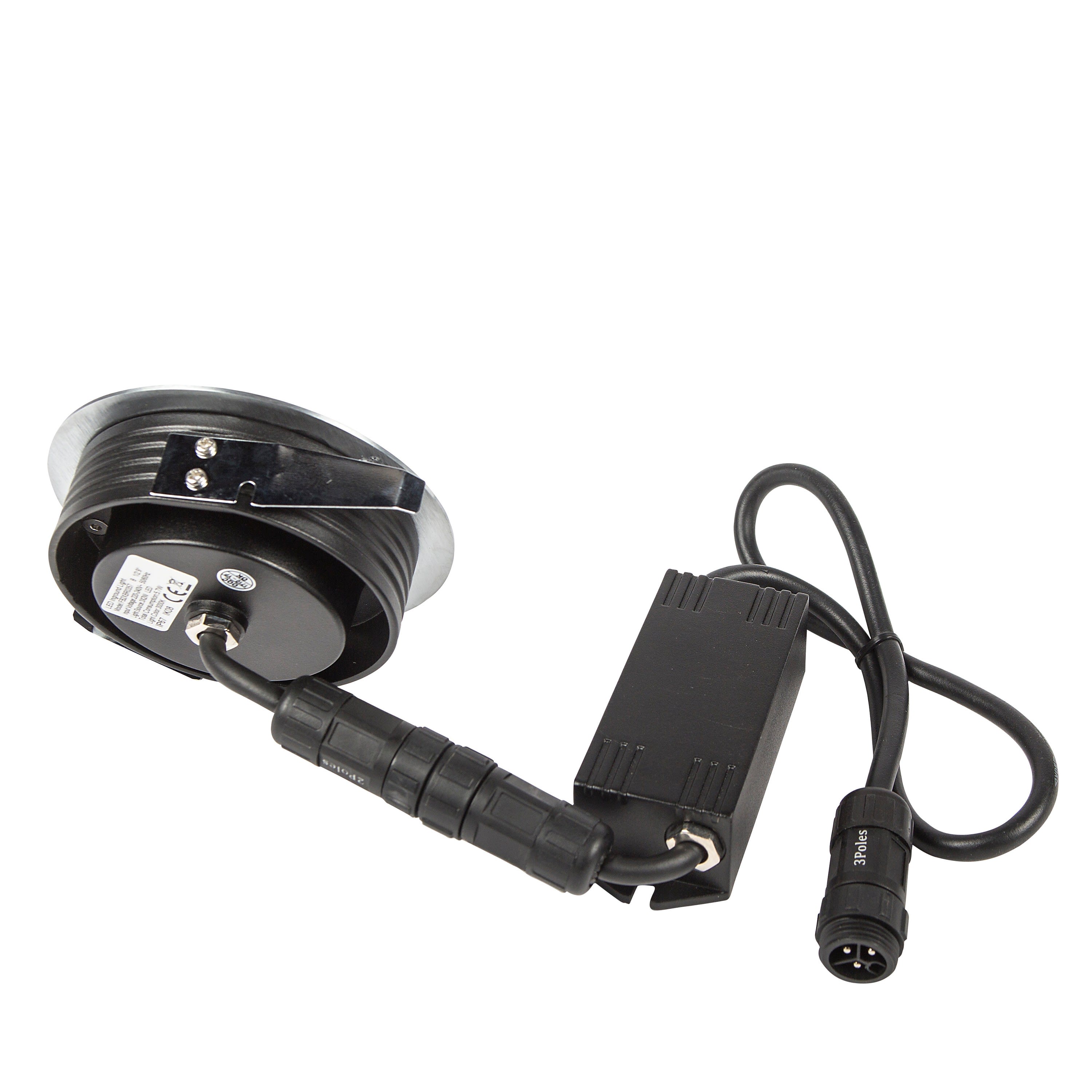 Encastré de sol EUROPOLE ZEPH 2 SLIM - 230 rond inox, collerette non percée, blanc 4000K, IRC>80, 3x2W, 368lm (61lm/W), verre transparent/nid d'abeille basse luminance, angle 10° (éclairage), 230VAC. Classe de protection I, IP67, IK08, câblé de 0,5m avec connectiques rapides IP68 Plug & Play mâle et femelle, HO5RN-F 3x1mm². Durée de vie : 30000h. Dimmable : Non. Dimension collerette : diamètre 116mm. Diamètre d'encastrement : 100mm. Matériau : corps en aluminium/collerette et visserie inox 316L. Traitement de la surface : traitement de la collerette par passivation, corps traité anticorrosion. Résistance environnement : garantie corrosion 15 ans. Températures de fonctionnement : -20°C/+40°C. Walkover : Oui. Driveover : Non. Submersible : Non. Installation uniquement en encastré dans terrasse ventilée. Alimentation déportée incluse.