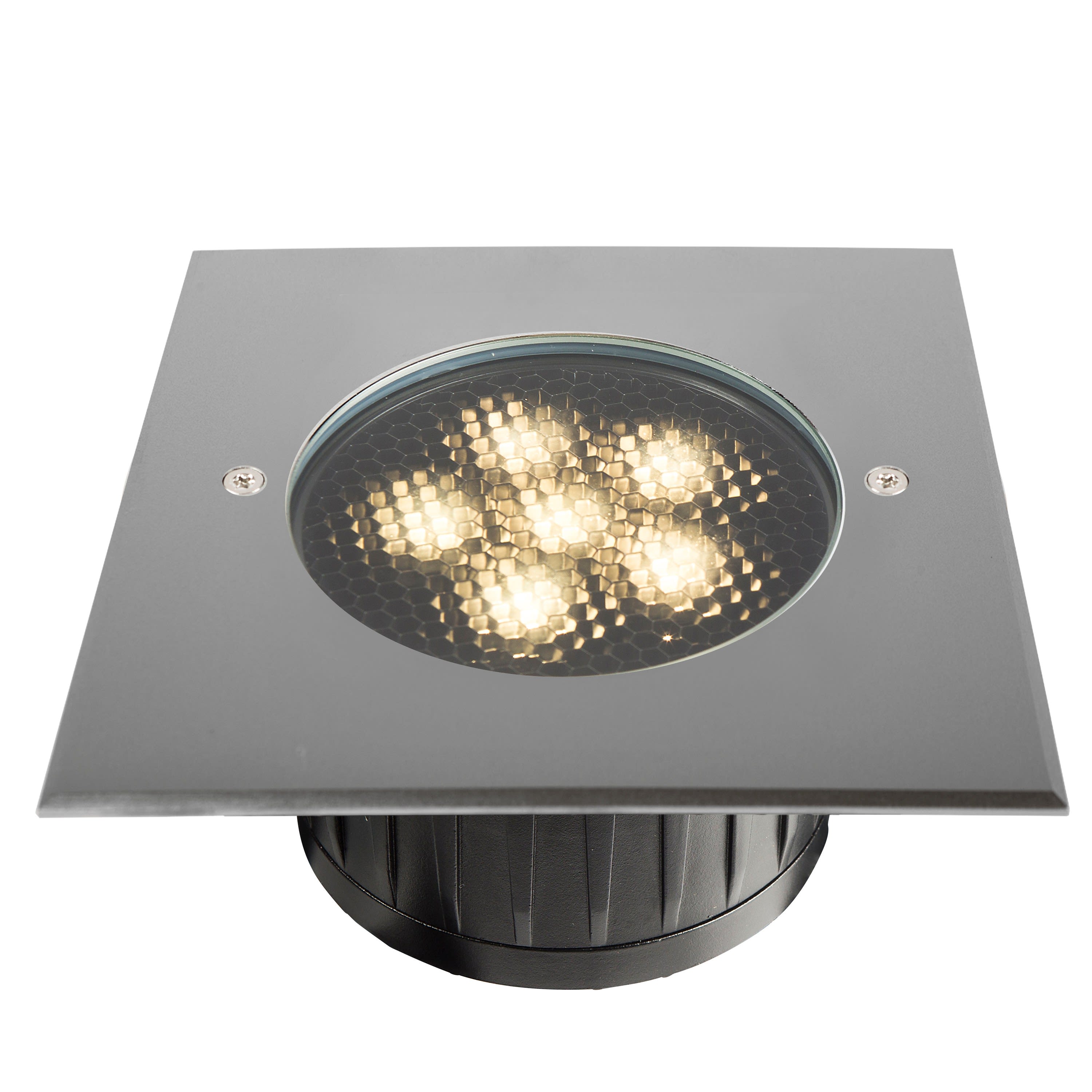 Encastré de sol ZEPH 3 - 230 carré : 173x173mm, inox, blanc 3000K, IRC>80, 6x2W, 925lm (77lm/W), verre transparent, 0/50° (éclairage), 230VAC. Classe I, IP67. IK08. Non dimmable