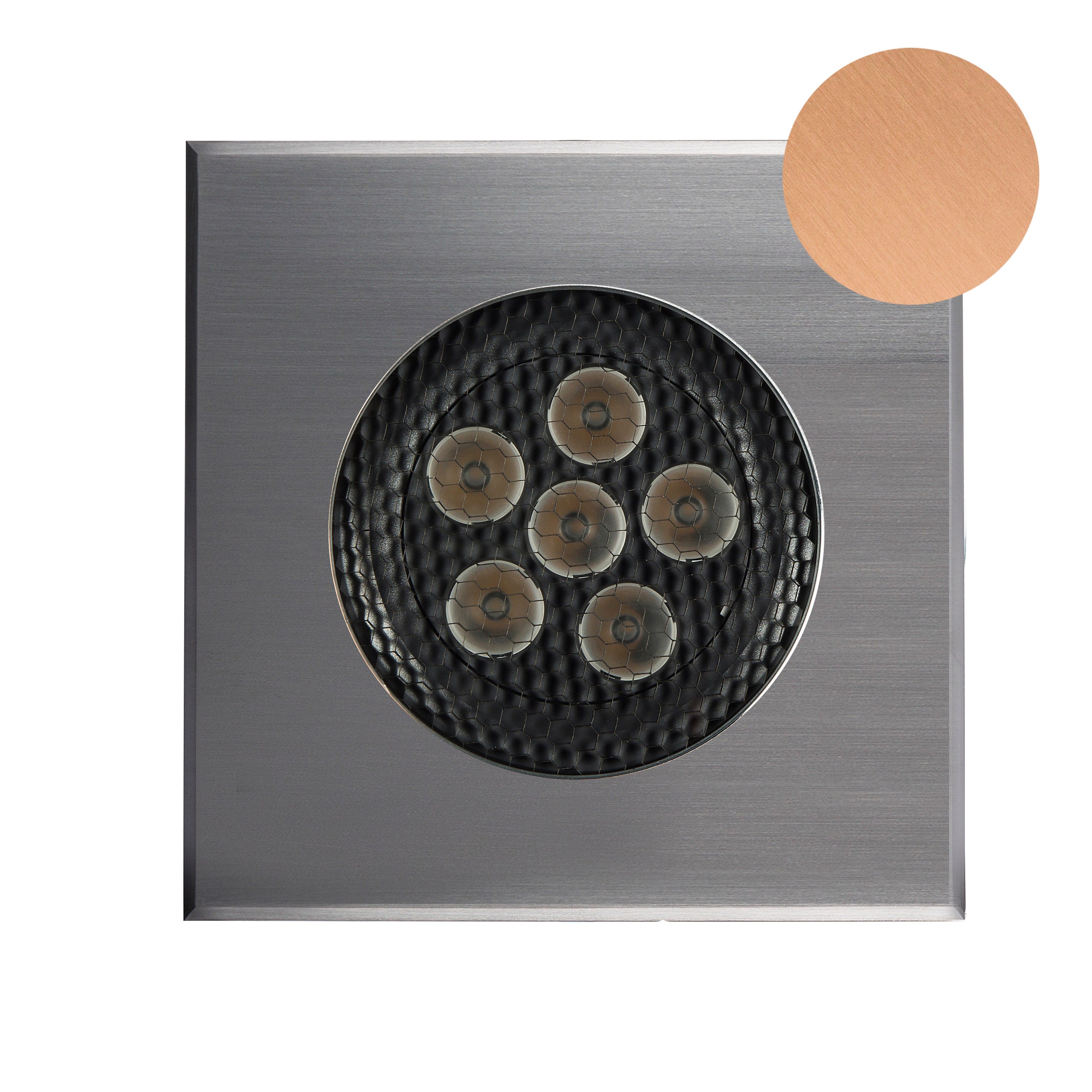 Encastré de sol ZEPH 3 - 24 carré : 173x173mm, bronze, blanc 3000K, IRC>80, 6x2W, 740lm (62lm/W), verre transparent/nid d'abeille basse luminance, 10° (éclairage), 24VDC. Classe III, IP67. IK08. Dimmable.