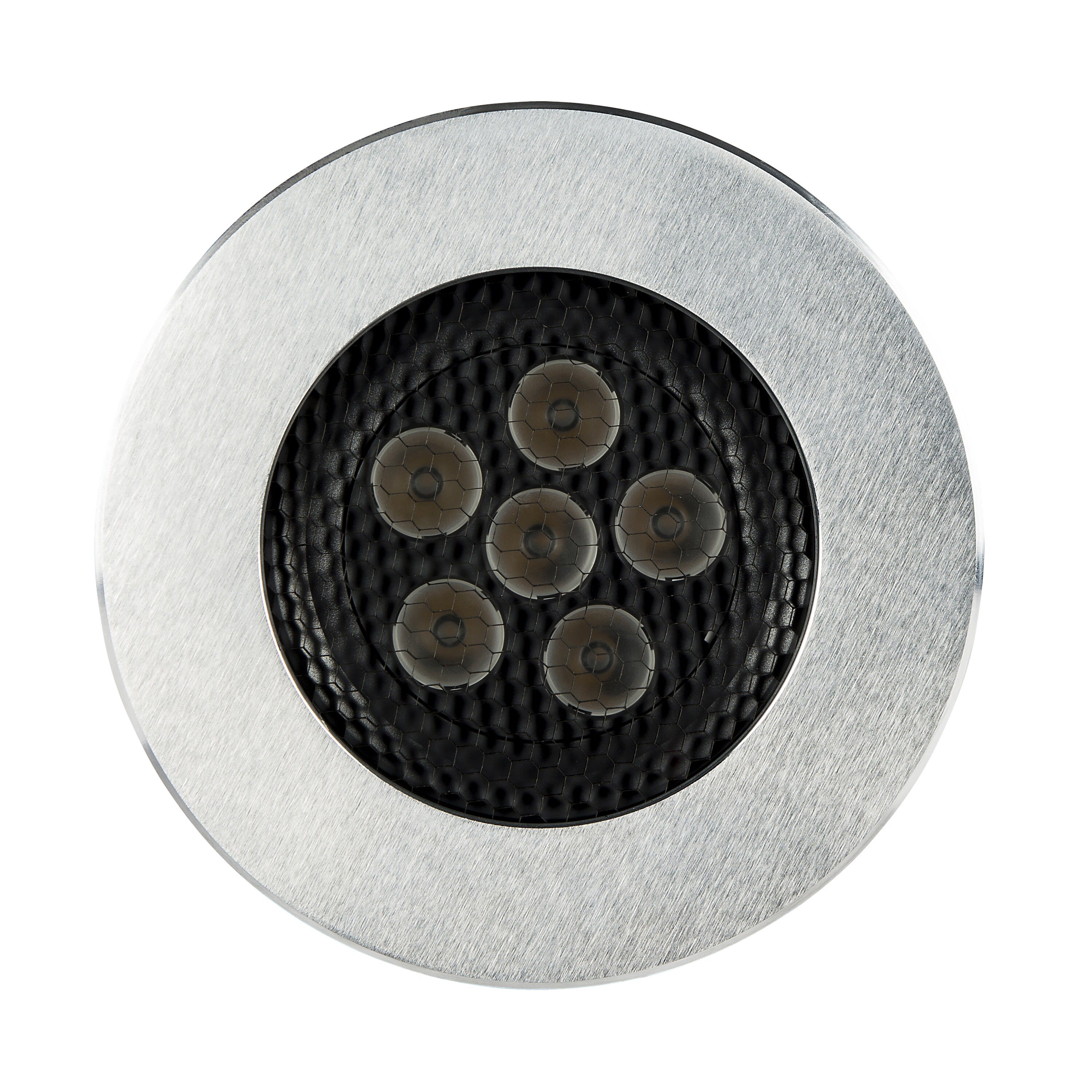 Encastré de sol EUROPOLE ZEPH 3 SLIM - 24 rond inox, collerette non percée, bleu 6x2W, verre transparent/nid d'abeille basse luminance, angle 10° (éclairage), 24VDC. Classe de protection III, IP67, IK08, câblé de 0,5m avec connectiques rapides IP68 Plug & Play mâle et femelle, HO5RN-F 2x1mm². Durée de vie : 30000h. Dimmable : Oui, variation avec alimentation/contrôleur compatible (non inclus). Dimension collerette : diamètre 173mm. Diamètre d'encastrement : 155mm. Matériau : corps en aluminium/collerette et visserie inox 316L. Traitement de la surface : traitement de la collerette par passivation, corps traité anticorrosion. Résistance environnement : garantie corrosion 15 ans. Températures de fonctionnement : -20°C/+40°C. Walkover : Oui. Driveover : Non. Submersible : Non. Installation uniquement en encastré dans terrasse ventilée.