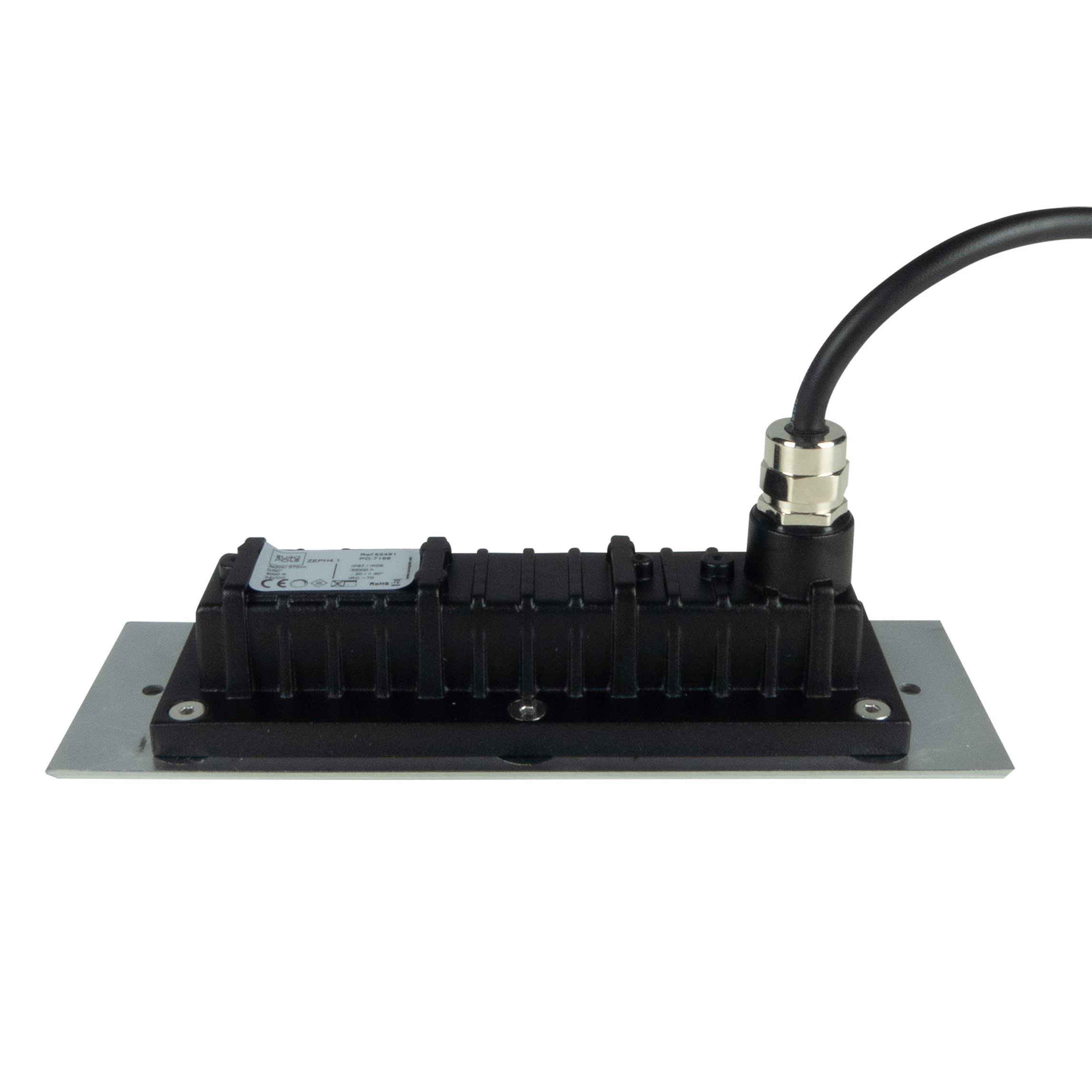 Encastré de sol EUROPOLE ZEPH 4.1 - 24 rectangle inox, collerette , blanc 3000K, IRC>80, 3x2W, 525lm (88lm/W), verre transparent, angle 30° (éclairage), 24VDC. Classe de protection III, IP67, IK08, câblé de 0,5m avec connectiques rapides IP68 Plug & Play mâle et femelle, HO5RN-F 2x1mm². Durée de vie : 30000h. Dimmable : Oui, variation avec alimentation/contrôleur compatible (non inclus). Dimension collerette : 195x63mm. Dimension d'encastrement : 184x58mm. Matériau : corps en aluminium/collerette et visserie inox 316L. Traitement de la surface : corps traité anticorrosion. Résistance environnement : garantie corrosion 15 ans. Températures de fonctionnement : -20°C/+40°C. Walkover : Oui. Driveover : Non. Submersible : Non.