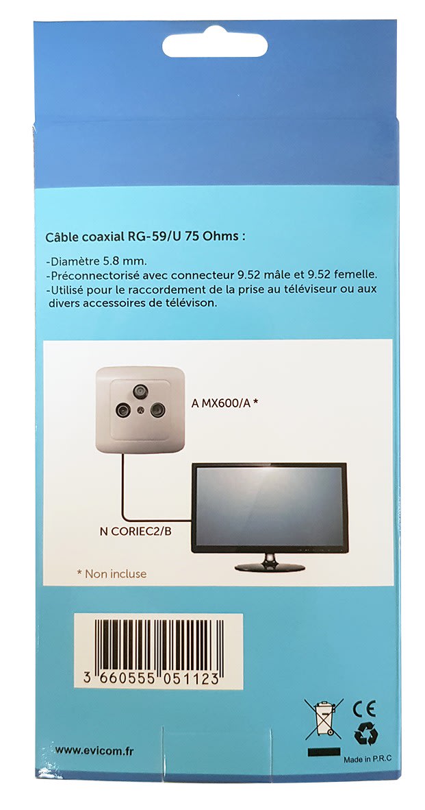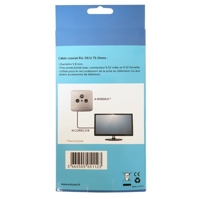 • Cordon coaxial RG59 IEC (9.52 mm) mâle/femelle sous carton