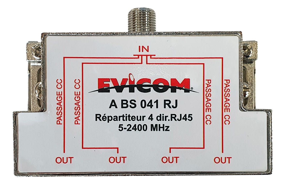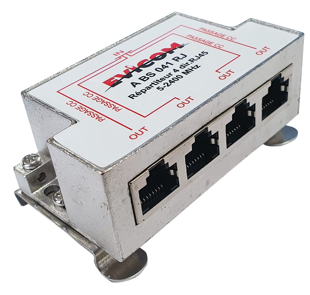 Répartiteur ULB 4 directions à connectique d'entrée F et de sorties RJ45 (montage mural ou Rail DIN) avec fonction BALUN • Pattes de fixation rail DIN fournies • Passage : Ter : 9.5 dB, Sat :14.0 dB • Passage alim. sortie -> entrée