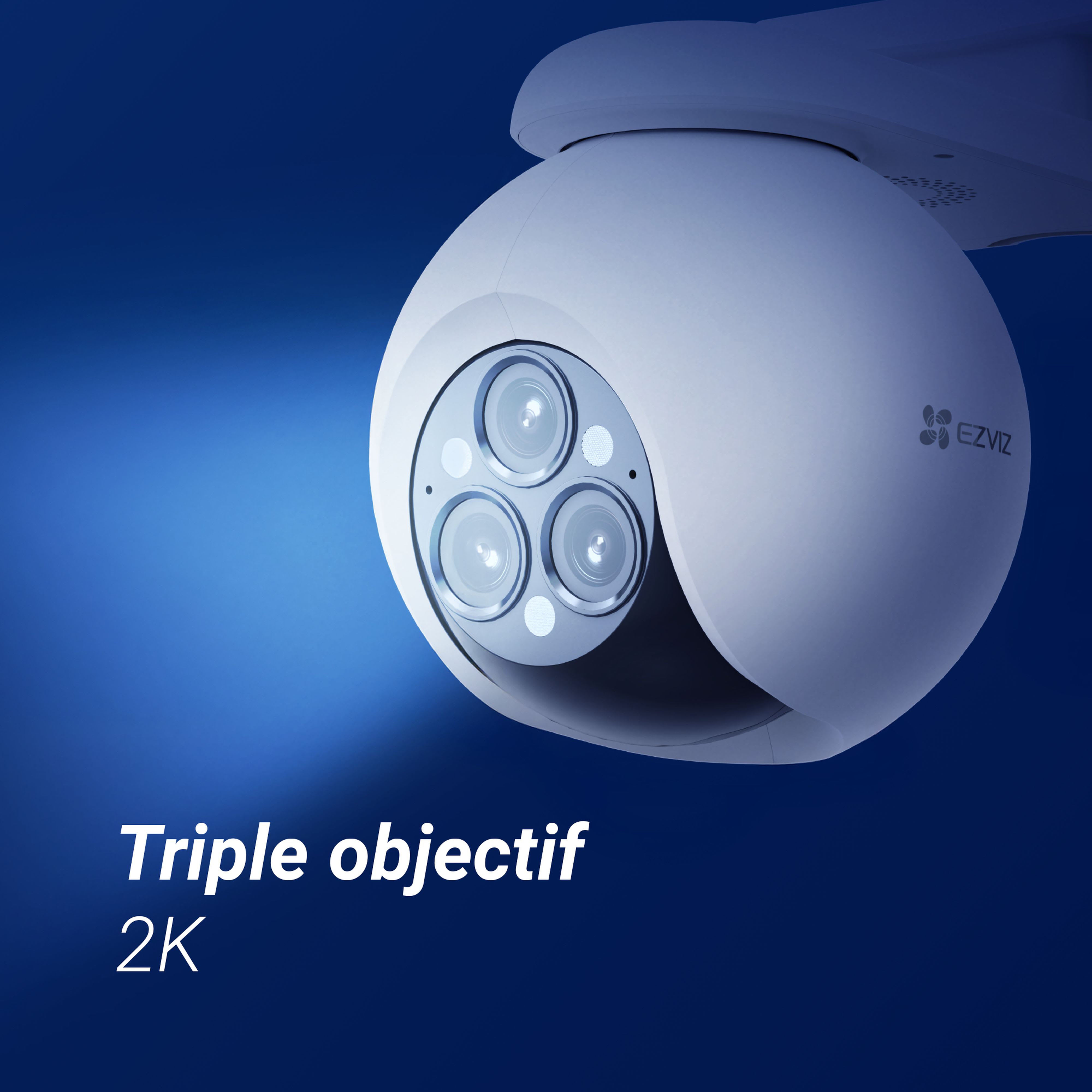 La H80f Multi, première caméra extérieure à triple objectif d'EZVIZ, est conçue pour assurer une sécurité extérieure exceptionnelle avec un professionnalisme invisible. La capacité intégrée de trois puissants objectifs 2K+ permet à la caméra de captu