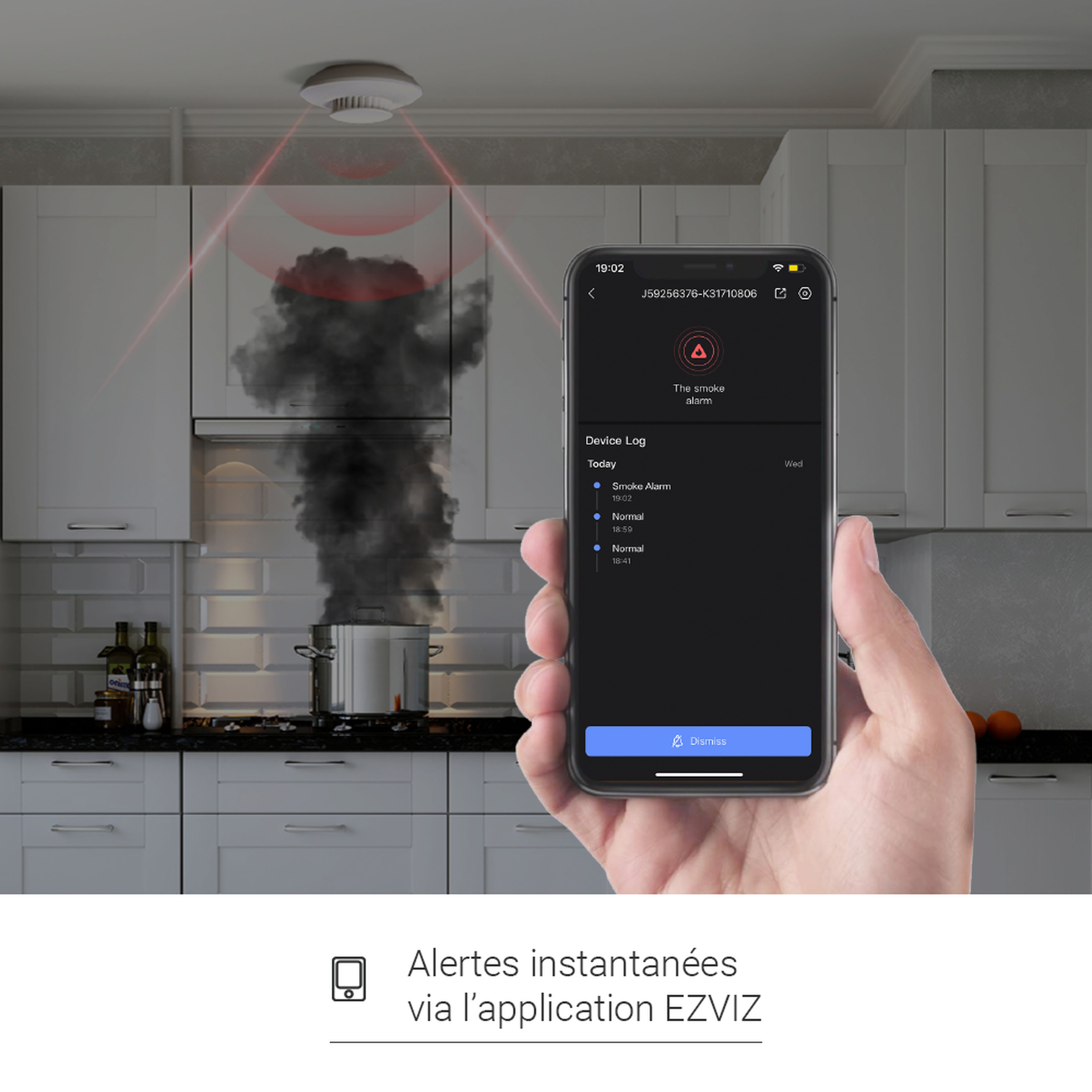 T4C/Détecteur de fumée/Sirène forte (85 dB) & Alarme d?éclairage stroboscopique/Conception compact et légère/Installation auto-collante/Conception économe en énergie avec batterie longue duré/Alertes instantanées via l?application EZVIZ