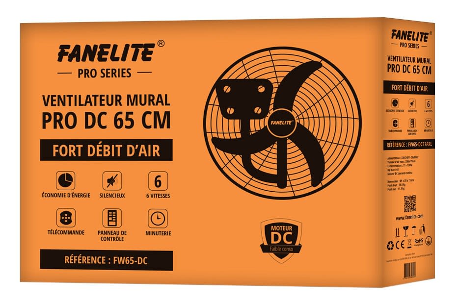 Fanelite - Ventilateur mural DC Pro 65 cm - Noir - Télécommande - Puissant - FW65-DC