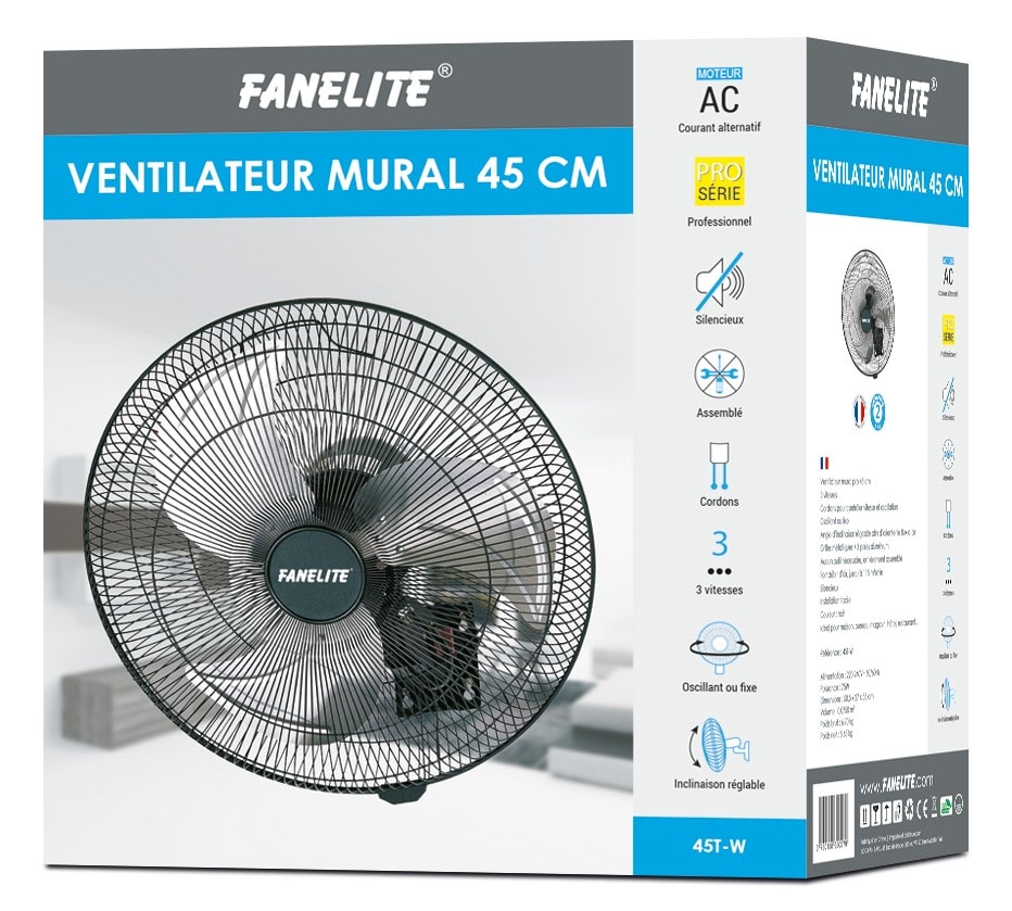 Fanelite - Ventilateur mural Pro 45 cm - Noir - Cordons - Puissant - 45T-W