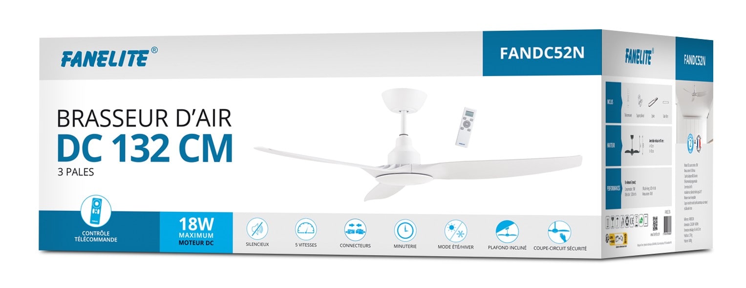 Fanelite - Ventilateur plafond DC 132 cm - Blanc - 3 pales - Télécommande - FANDC52N