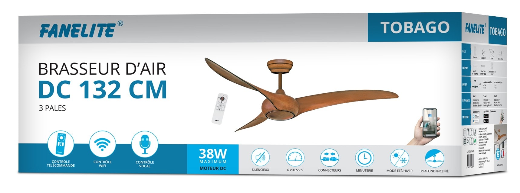 Fanelite - Ventilateur plafond DC 132 cm - Bois - 3 pales - Télécommande - Wifi - TOBAGO