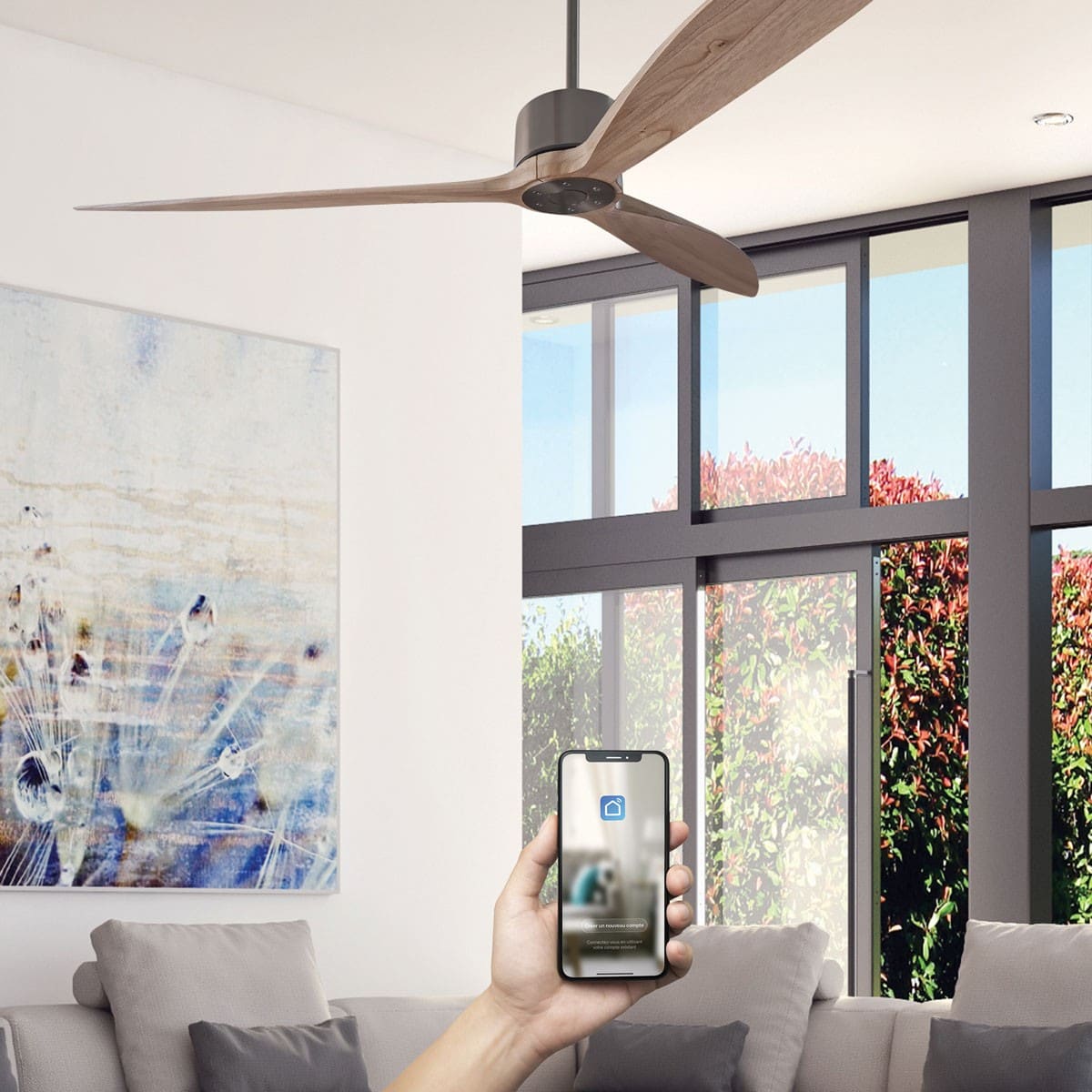Ventilateur de plafond DC courant continu - 164 cm - Gris/Bois - 3 pales bois - Moteur 35W - Télécommande, Wifi et contrôles vocaux - 6 vitesses - Très silencieux - Mode été/hiver - Fonction mémoire - Minuterie