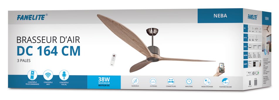 Fanelite - Ventilateur plafond DC 164 cm - Gris/Bois - 3 pales - Télécommande - Wifi - NEBA
