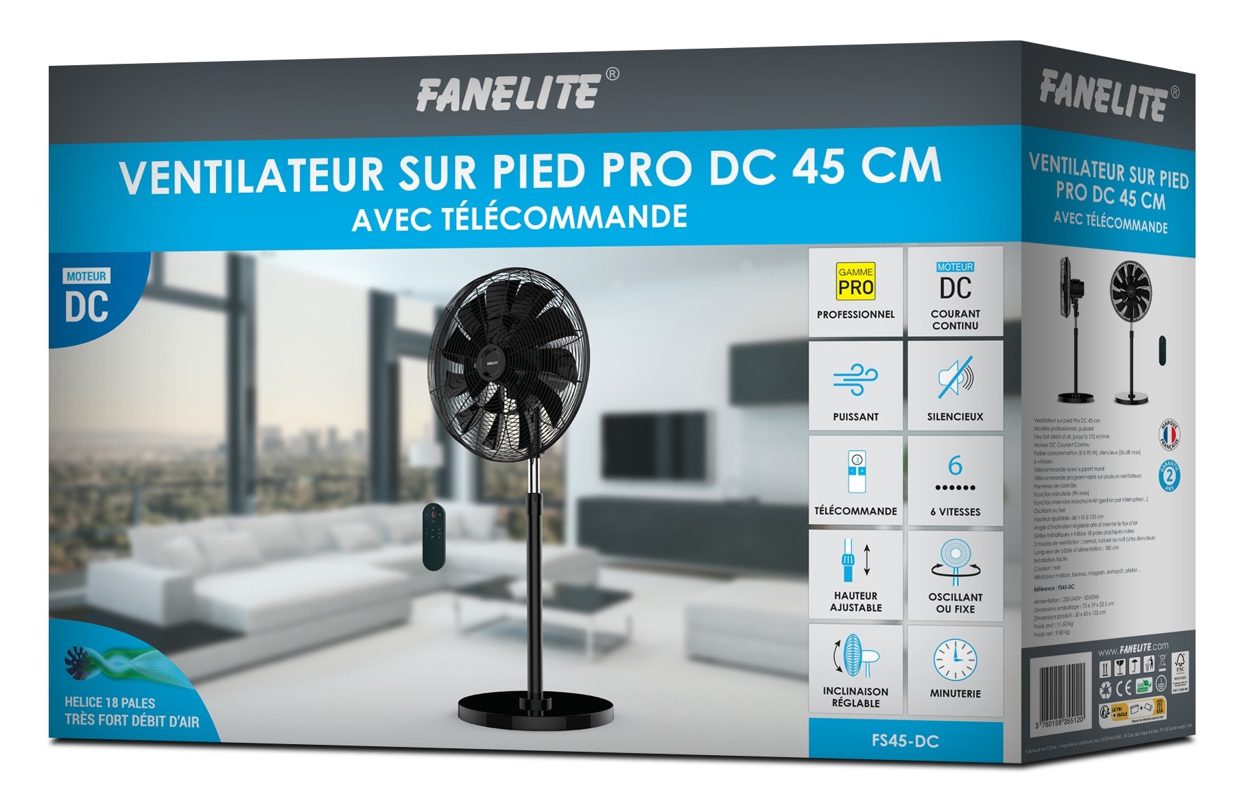 Fanelite - Ventilateur sur pied DC Pro 45 cm - Noir - Télécommande - Puissant - FS45-DC