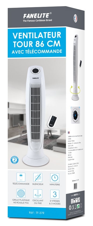 Fanelite - Ventilateur tour/colonne 86 cm - Blanc - Plastique - Télécommande - TF-37R