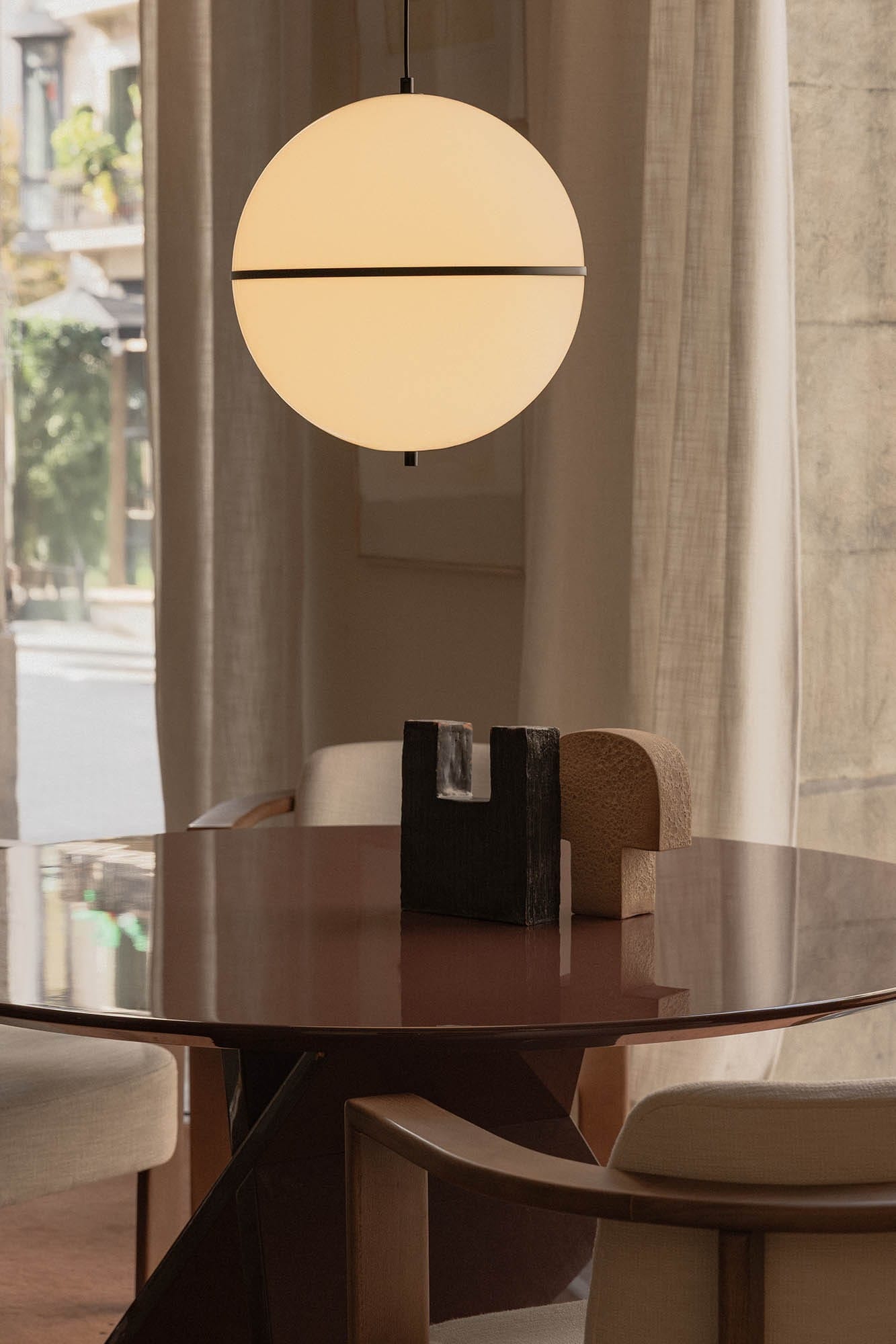 DOME M suspension noire conçue par Faro Lab, qui réinterprète les classiques avec une approche minimaliste, utilisant des formes simples et épurées. Destinée à créer une atmosphère chaleureuse et accueillante dans des environnements domesti