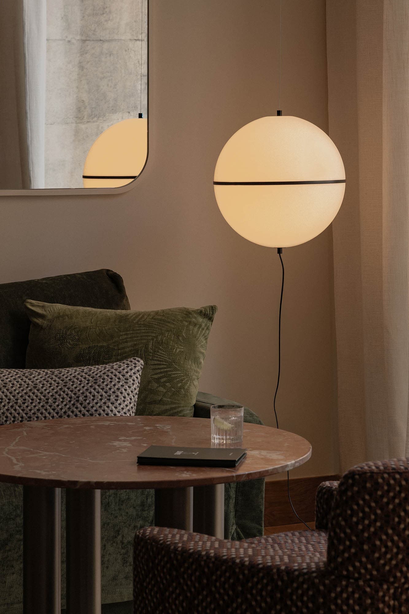 DOME M suspension noire conçue par Faro Lab avec interrupteur, qui réinterprète les classiques avec une approche minimaliste, utilisant des formes simples et épurées. Destinée à créer une atmosphère chaleureuse et accueillante dans des envi