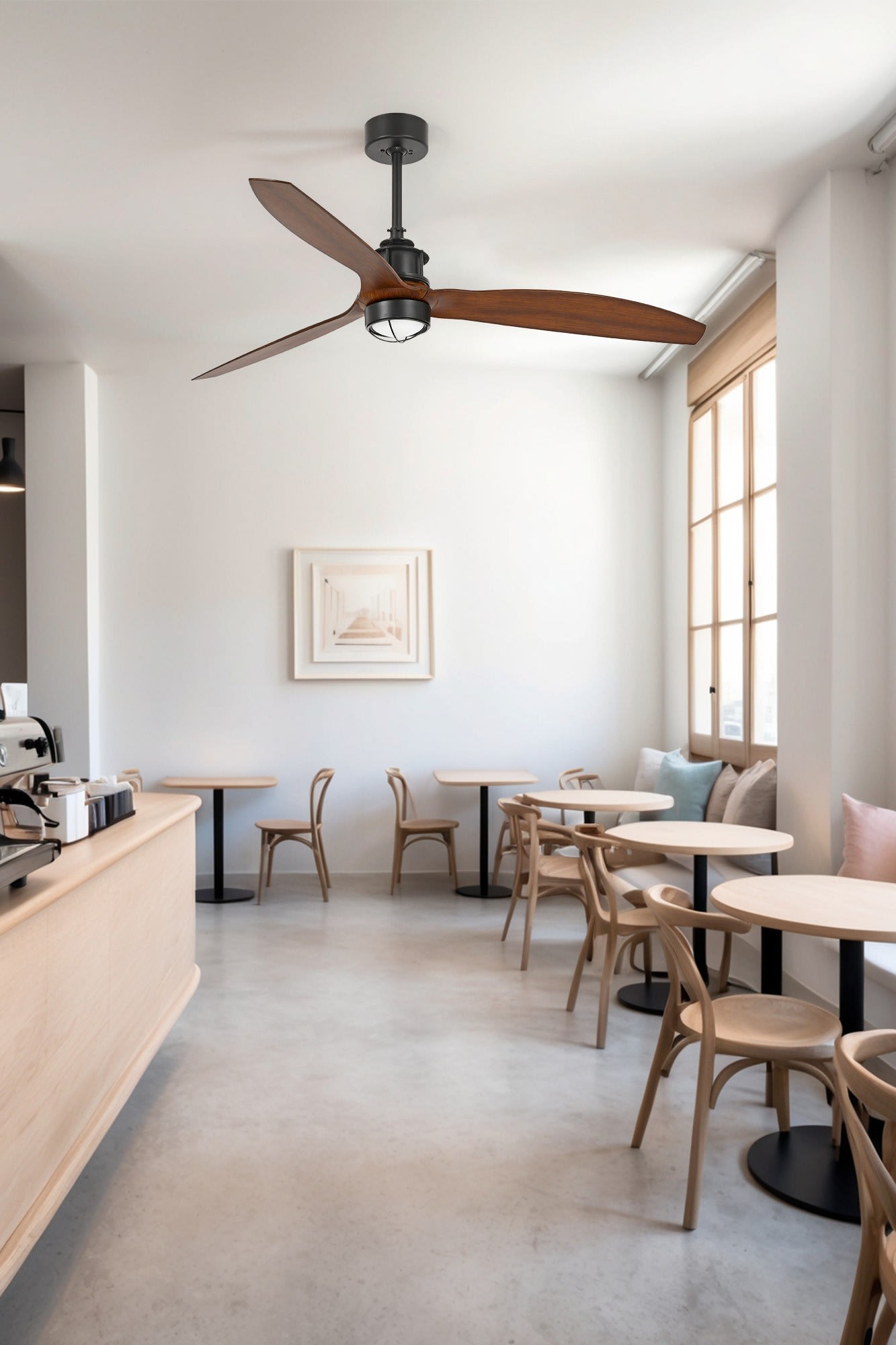 Just Fan est un ventilateur de plafond en surface avec finition des pales noyer, avec taille M. Équipé d’un moteur DC, il propose 6 vitesses réglables, dispose d’une fonction inverse et est adapté aux plafonds inclinés.
