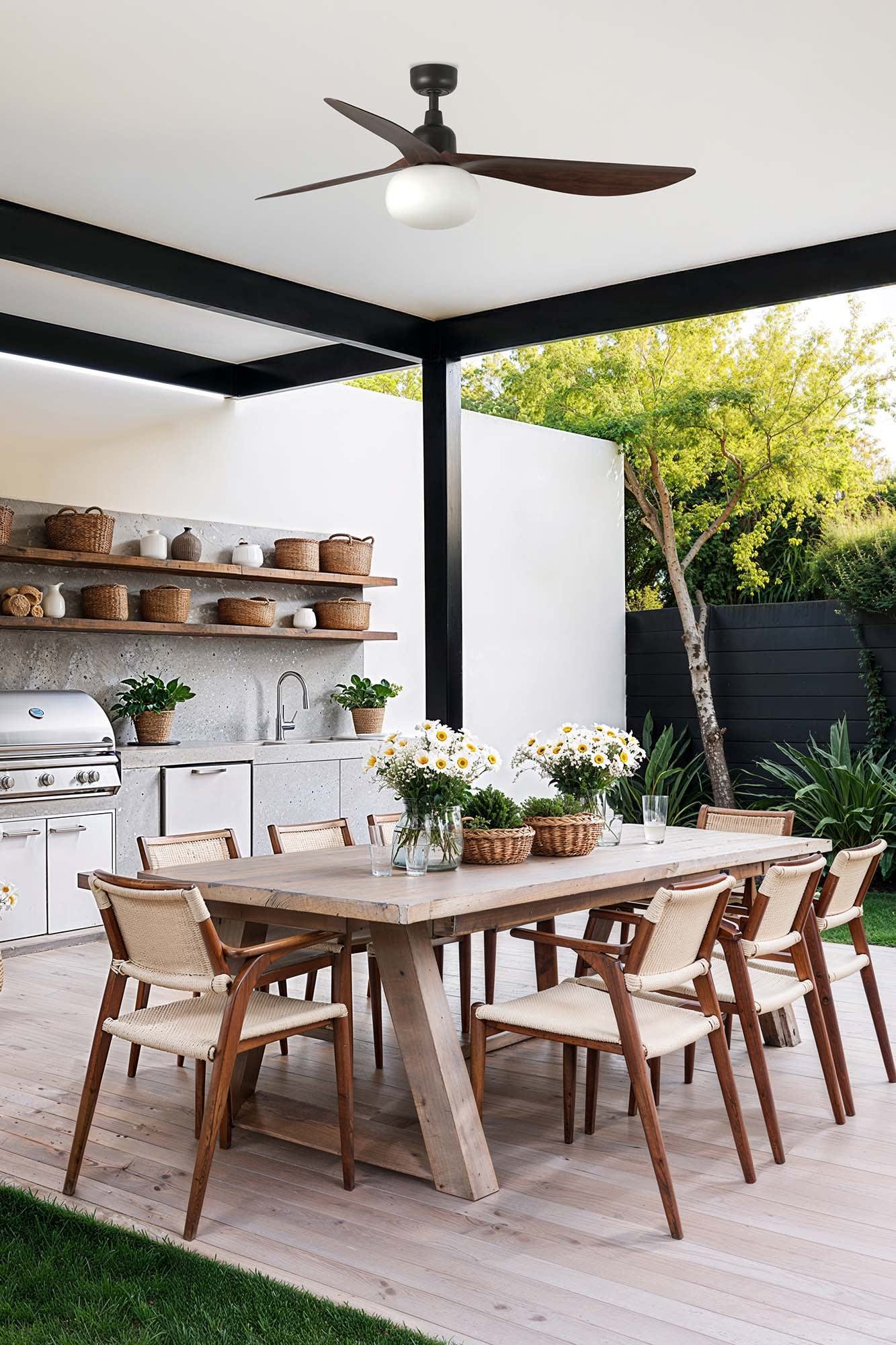 Outwood est un ventilateur de plafond en surface avec finition des pales noyer, avec taille L. Équipé d’un moteur DC, il propose 6 vitesses réglables, dispose d’une fonction inverse et est adapté aux plafonds inclinés.