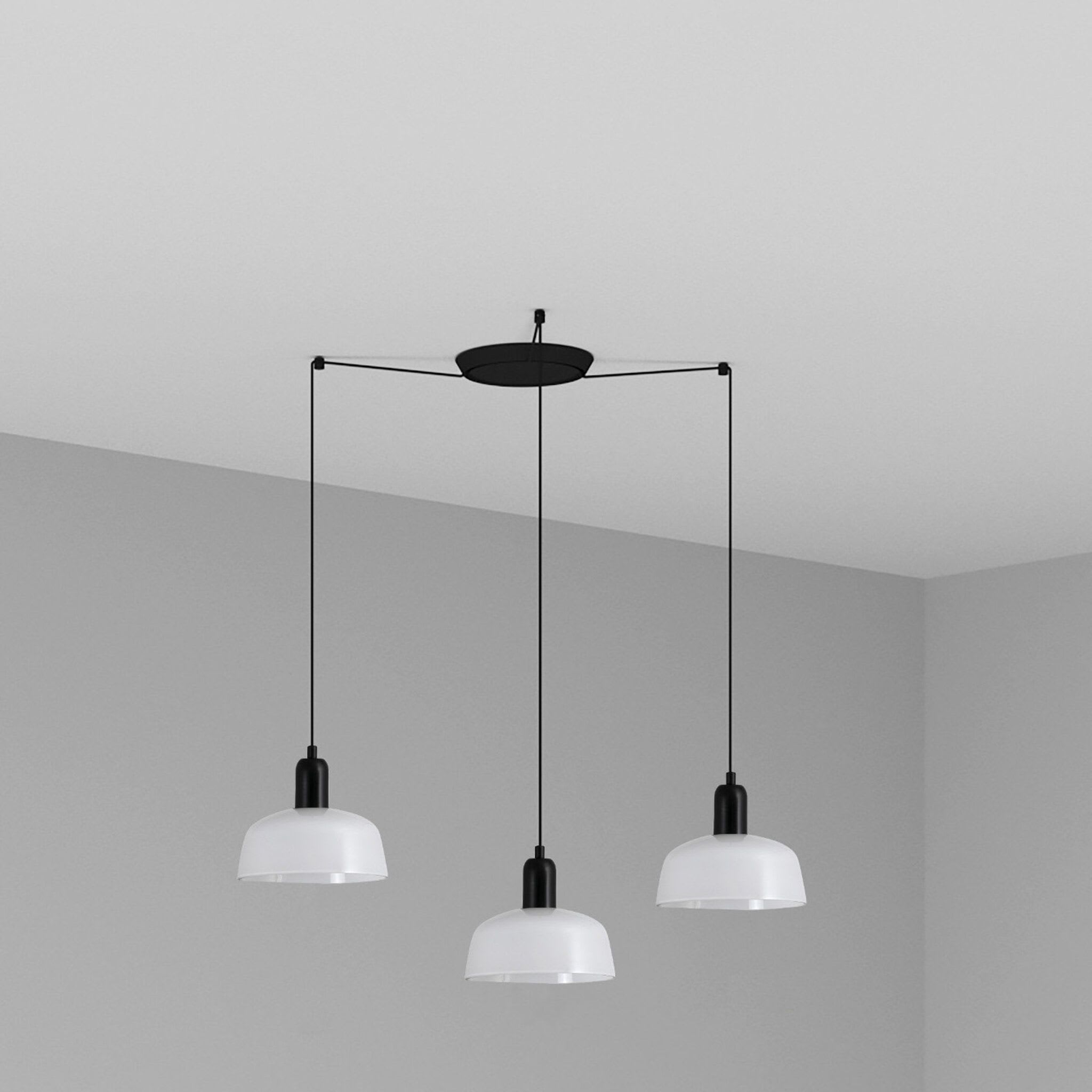 Cette gamme constitue la solution idéale pour créer des compositions à partir d'un seul point de lumière, tant dans les espaces contract que dans les intérieurs. Version avec abat-jour en verre opalin blanc et rosace multiple à 3 lampes.
