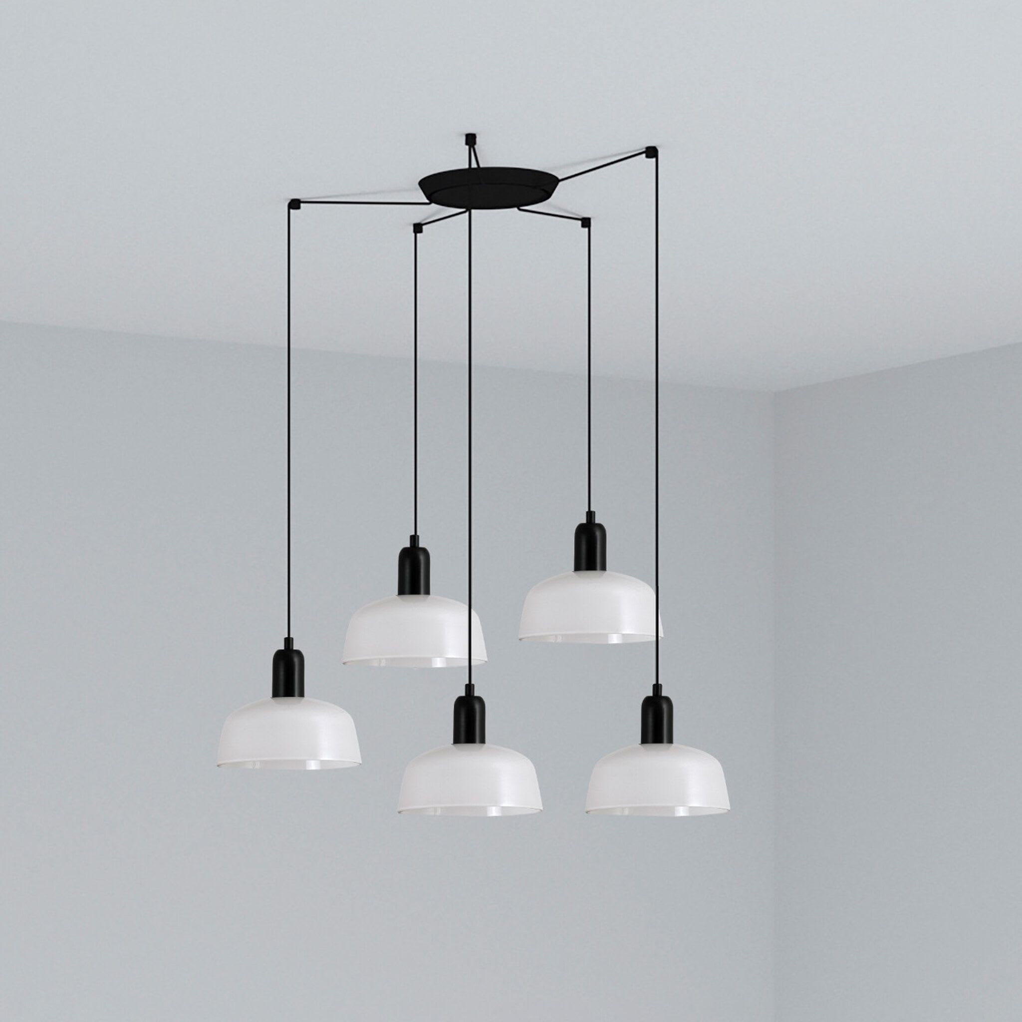 Cette gamme constitue la solution idéale pour créer des compositions à partir d'un seul point de lumière, tant dans les espaces contract que dans les intérieurs. Version avec abat-jour en verre opalin blanc et rosace multiple à 5 lampes.