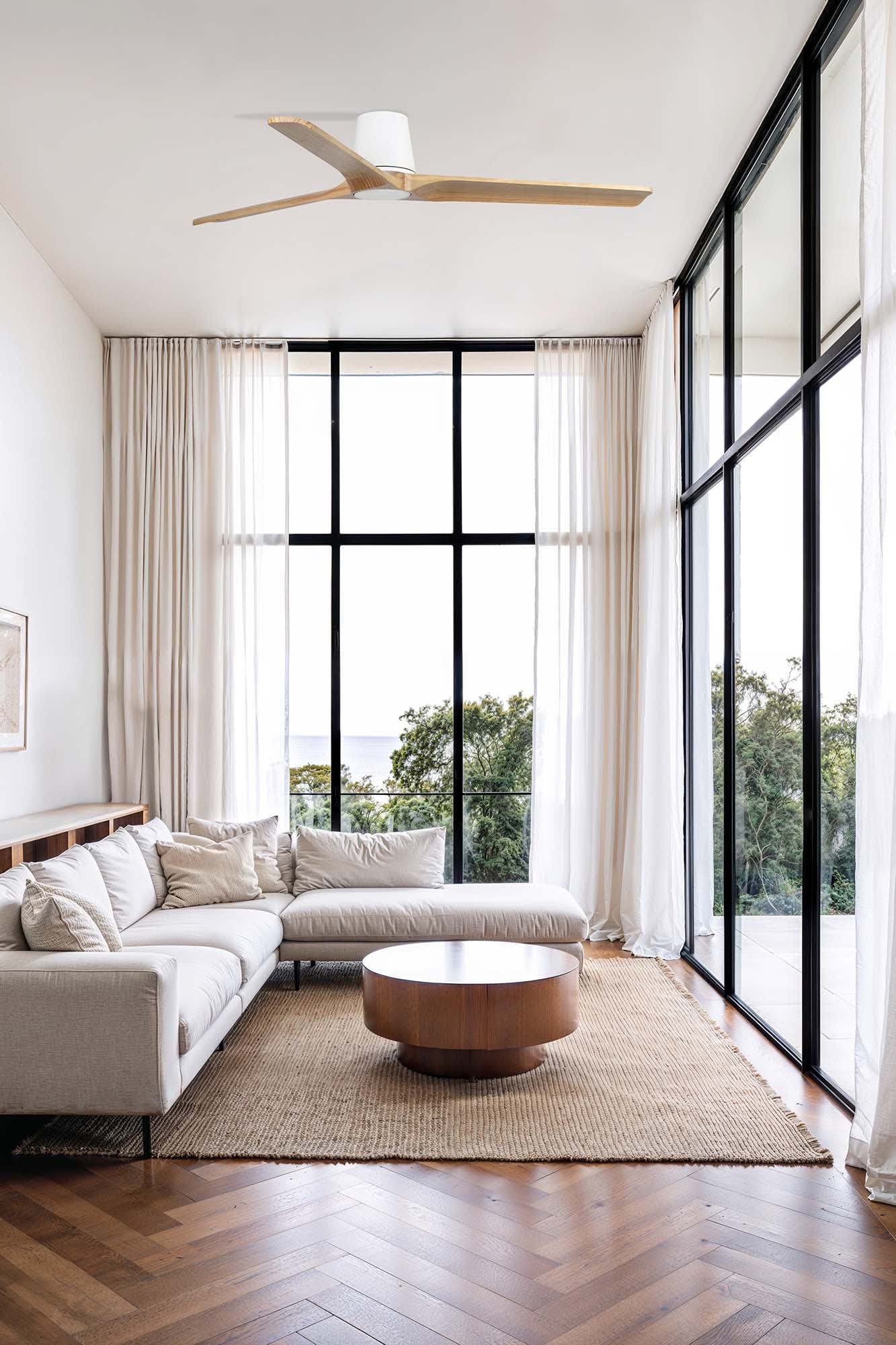 HEYWOOD TUB L est un ventilateur de plafond FSC conçu par Faro Lab, doté de 3 pales en bois clair, en version blanche. Équipé du système Smart Tuya intégré, il fonctionne en version plafond sans tige pour un design épuré et moderne.