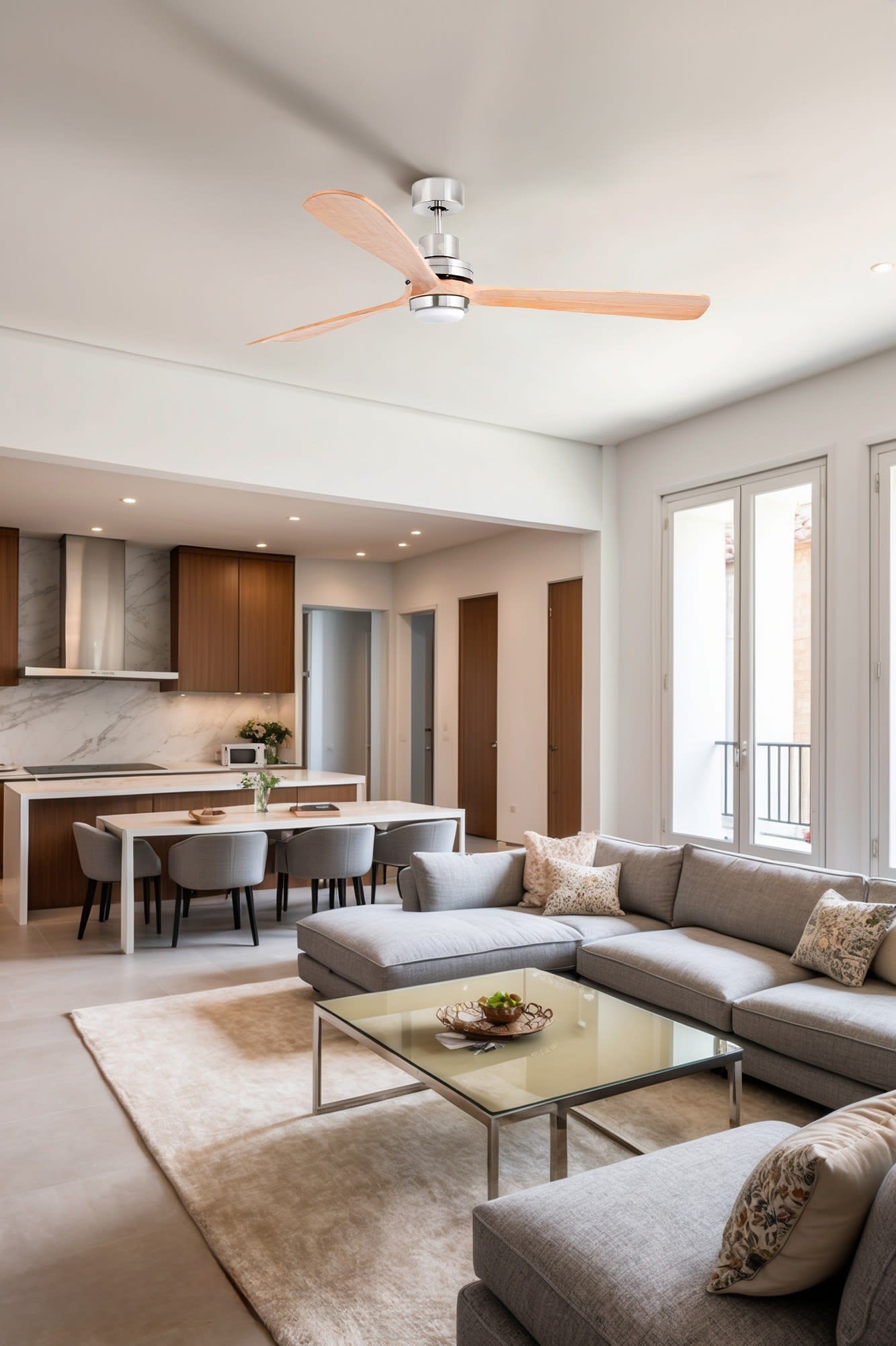 LANTAU est un ventilateur de plafond moderne au design innovant et esthétique, doté d’un moteur en acier et de pales en bois certifiées FSC, disponible en plusieurs coloris et tailles, avec ou sans éclairage. Il est équipé d’une télécommande, possède 6 vitesses réglables et une fonction inverse pour une utilisation hivernale, améliorant ainsi l’efficacité du chauffage. Il peut être installé sur des plafonds mansardés et est compatible avec le système SMART TUYA. Son excellente performance énergétique en fait une option conforme à la norme RE2020.