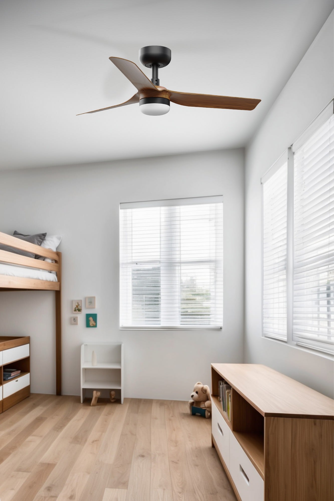 MINI PUNT S est un ventilateur de plafond au design moderne et minimaliste, en version noire avec 3 pales noyer. Il intègre un kit d’éclairage LED 10W et un système Smart Tuya pour une gestion intelligente et connectée.