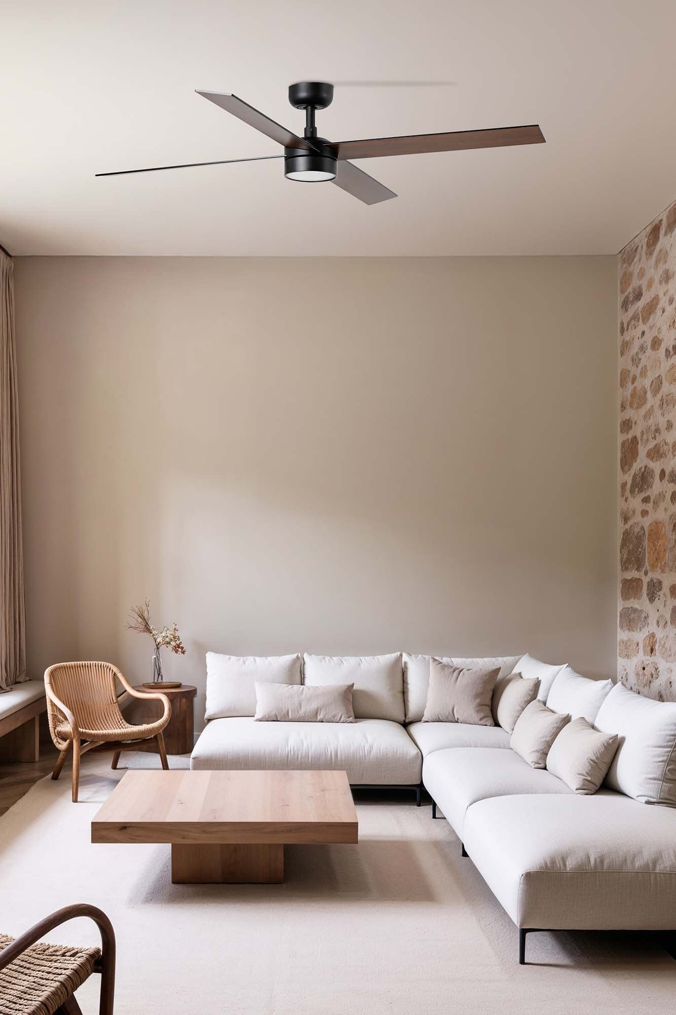 Le ventilateur RUDDER L est un modèle contemporain en version noire, doté de 4 pales en noyer pour un design moderne. Équipé d’un kit d’éclairage LED dimmable 18W, il intègre un système Smart Tuya pour une gestion connectée facilitée. Idéal pour un intérieur élégant.
