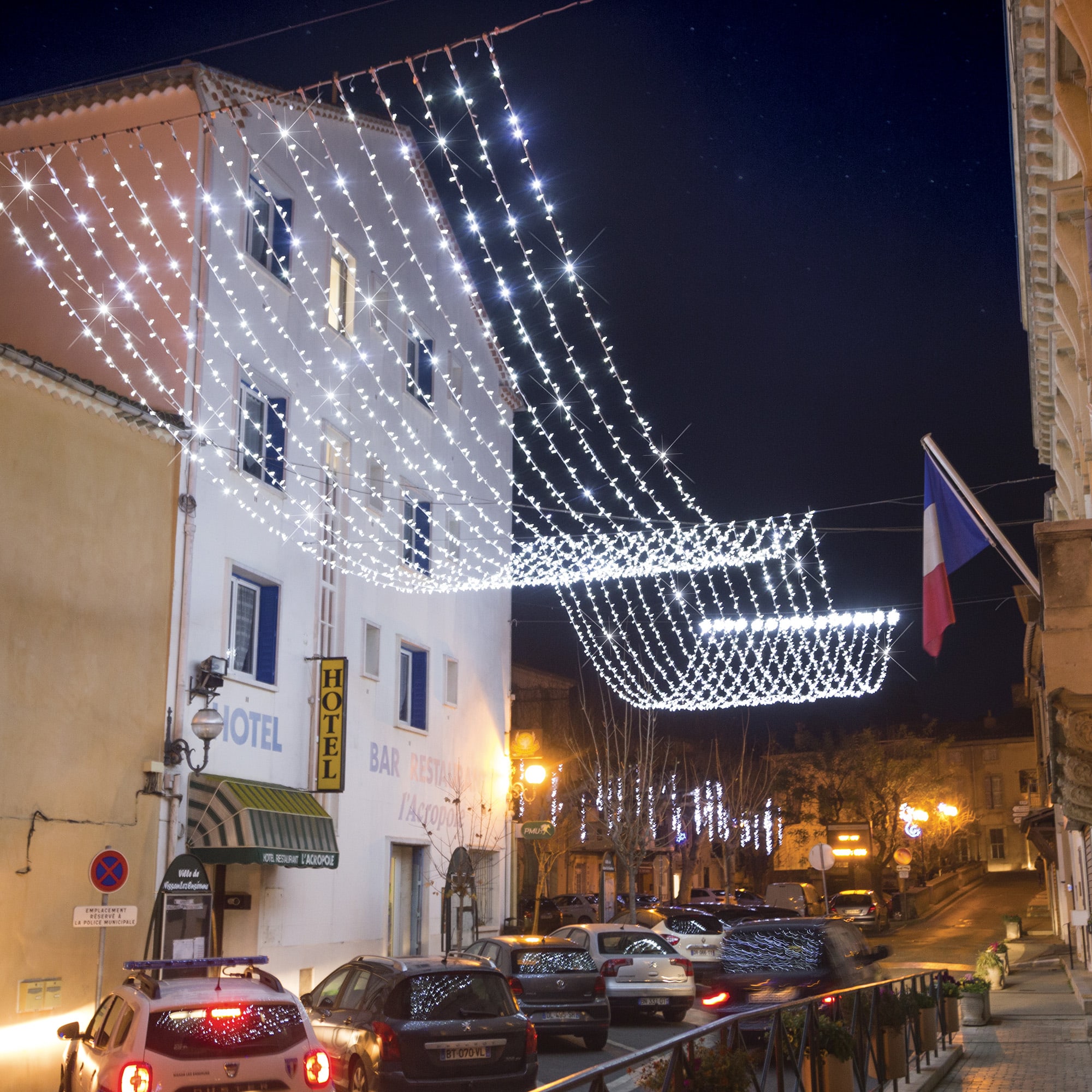 COSMIC Plafond lumineux LED, 2m x 10m (8 lignes de 10m) , 216 LED Blanc pétillant , câble blanc , 230V , IP66, raccordable en largeurUn fort pouvoir couvrant pour un cout maîtriséPétillement flashant élégant et raffiné : créez un bel effet de ciel étoilé scintillant au dessus de vos places et rues ou de votre espace de vente grâce à une LED blanche qui flash toutes les 9 LED
