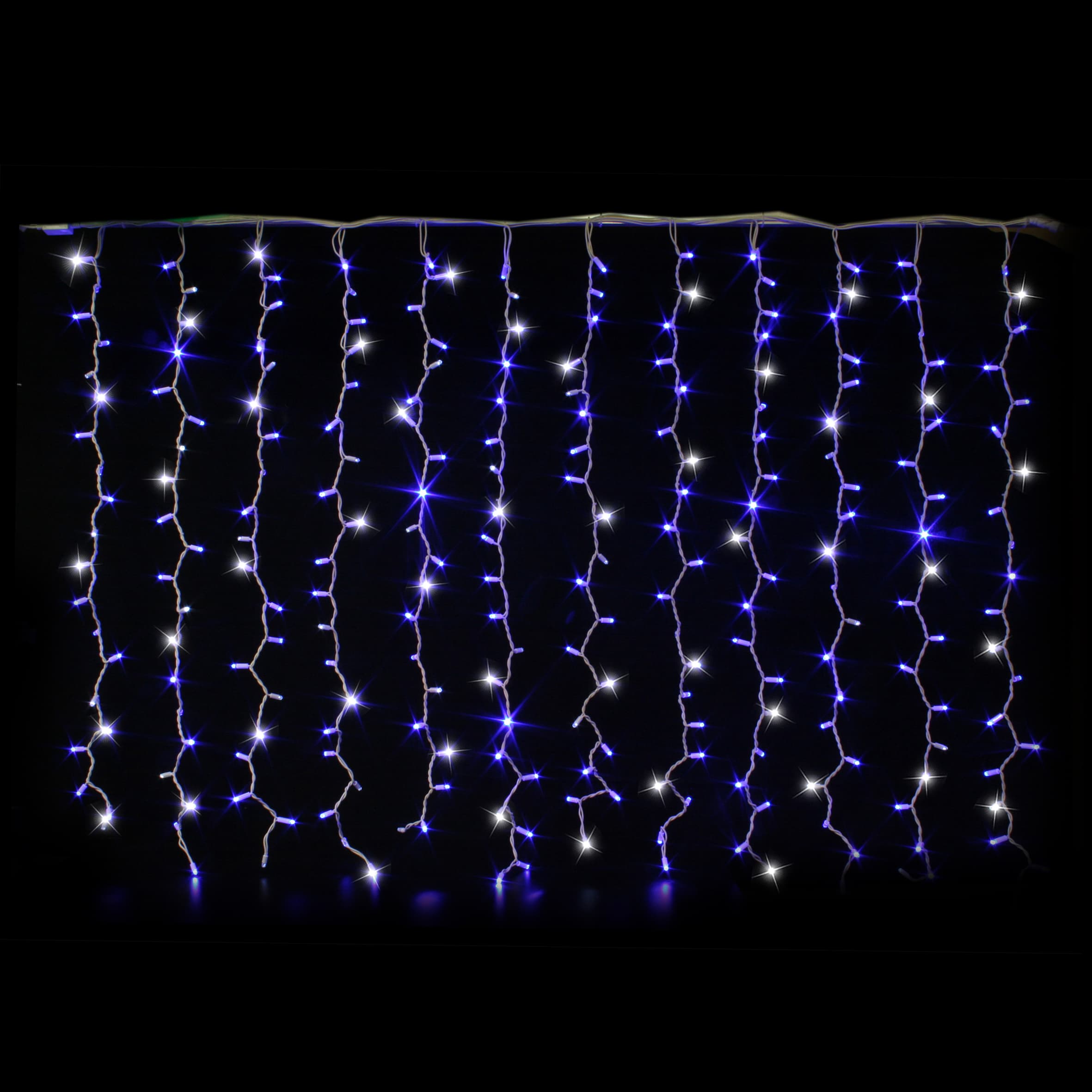 MASTER Rideau LED pétillant L2m x H1.5m 12 descentes 240 LED. Bleu pétillant blanc câble blanc 230V raccordable en largeur. Ultra-lumineux : LED de haute qualité, Ø8mm, construction à diffusion multidirectionnelle qui assure une parfaite répartition de la lumière. Pétillement flashant élégant et raffiné