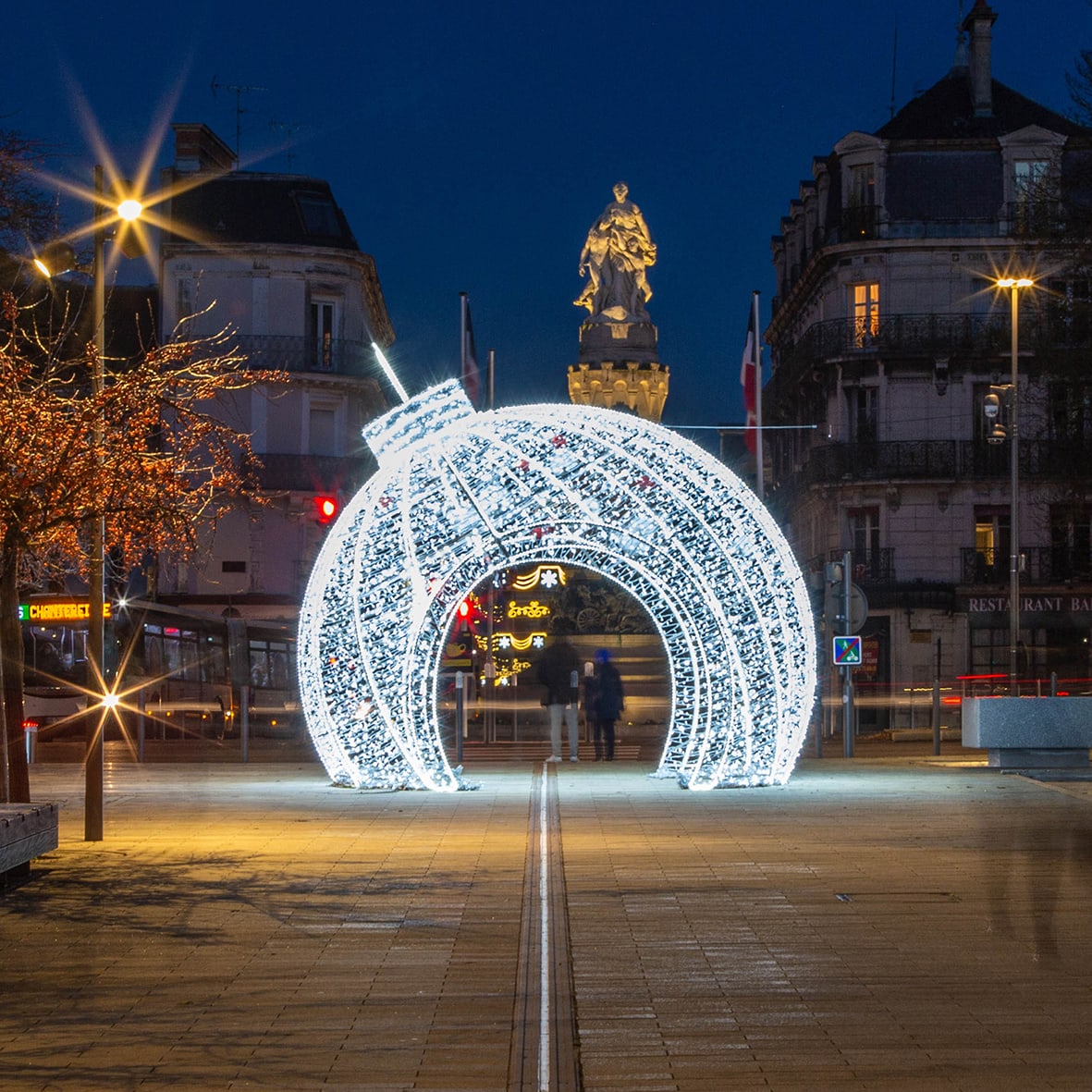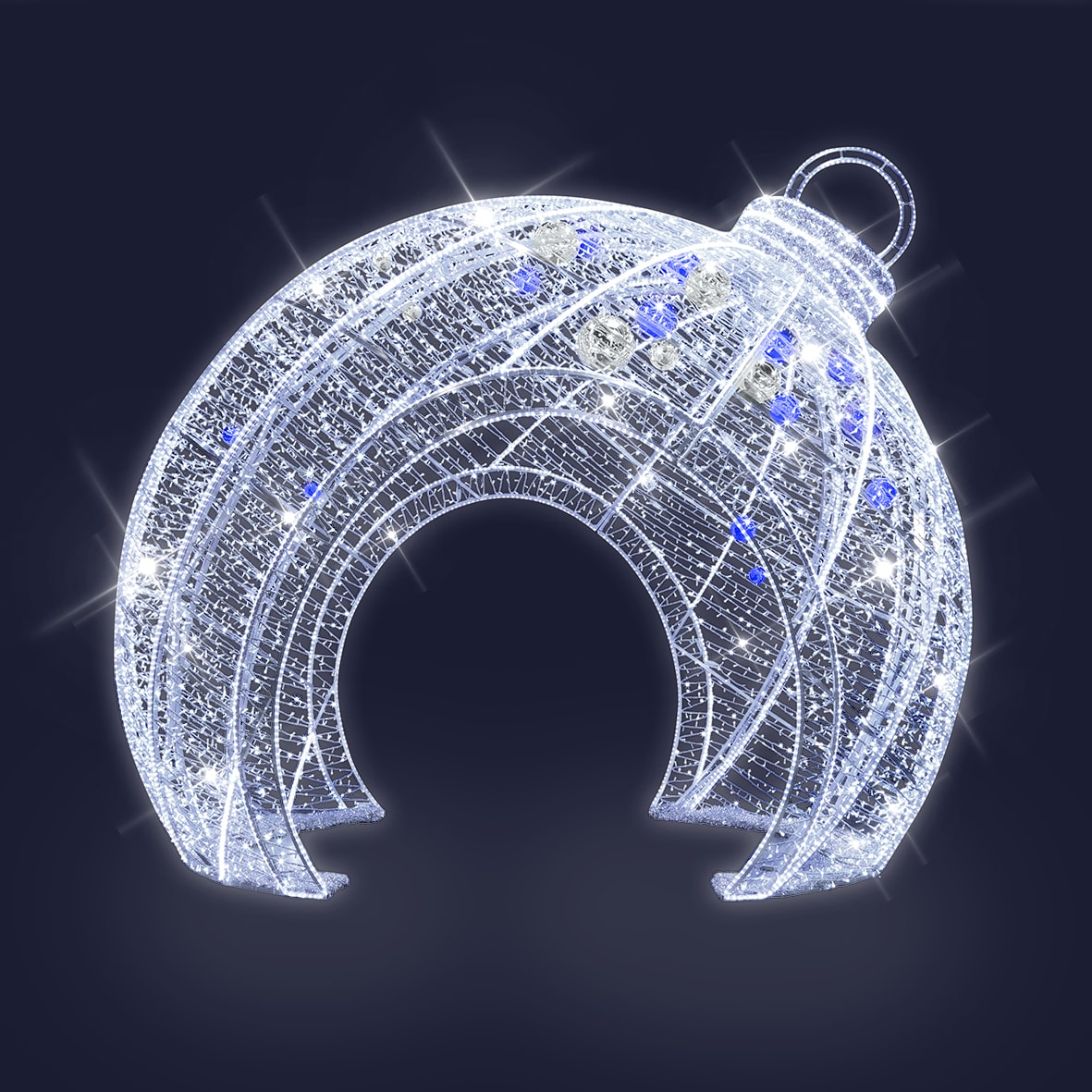 PASSAGE DE NOEL Ø4,90m x H4,30m 16960 LED Blanc pétillant 230V. Fourni avec 30 boules de Noël Ø 20/15/10cm. Véritable attraction lumineuse, décor grandeur nature