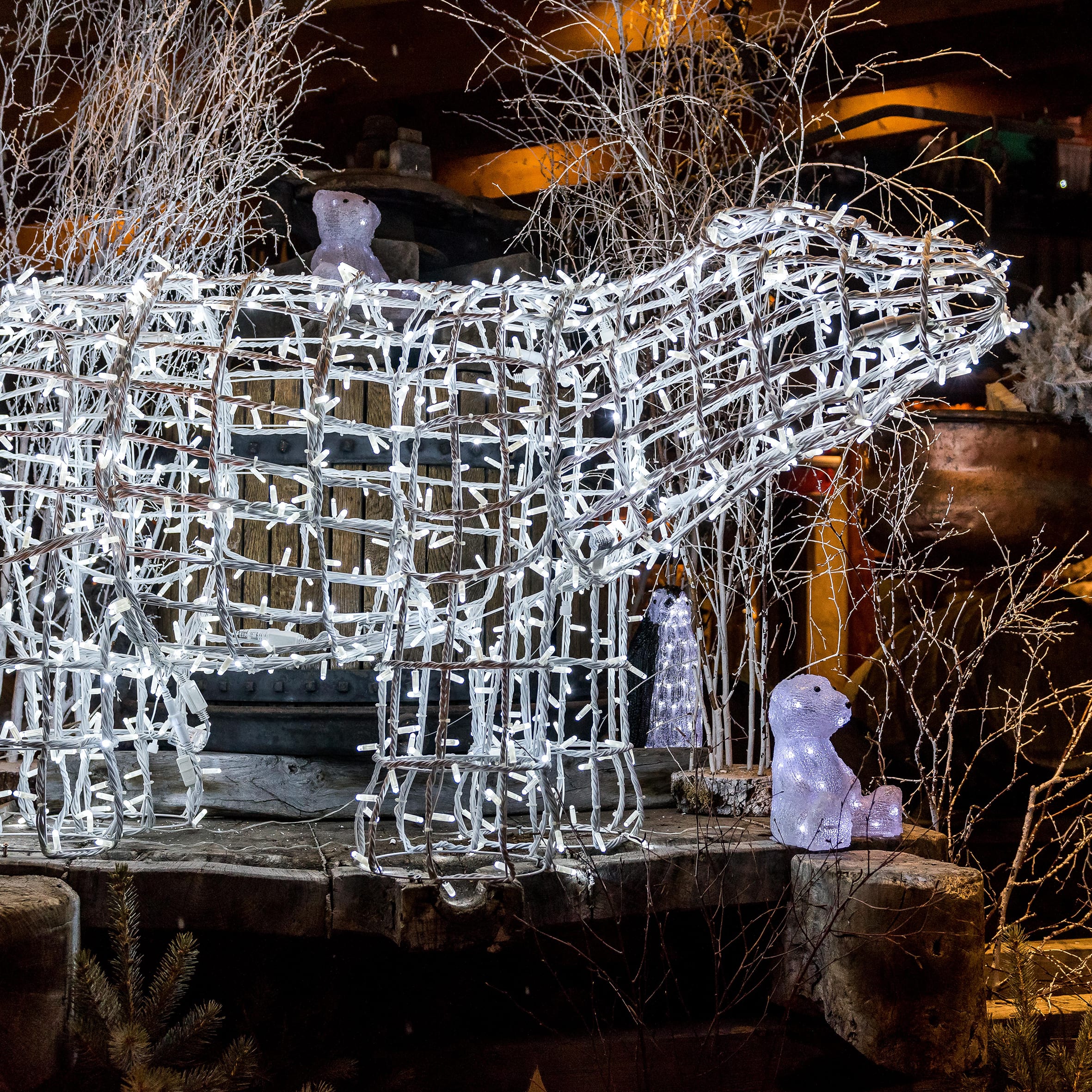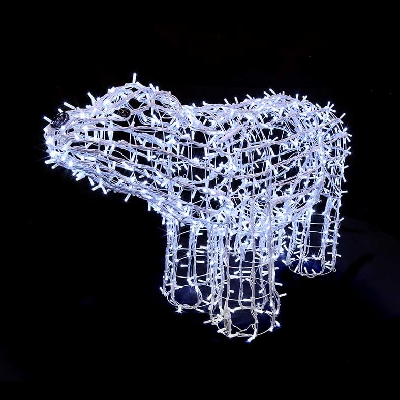 POLAR BEAR Ours polaire L1,75m x H98cm Structure métal blanche 900 LED blanc câble blanc 31V. Beau volume pour un coût maîtrisé. LED ultralumineuse & éclat : LED de haute qualité, Ø8mm, construction à diffusion multidirectionnelle qui assure une parfaite répartition de la lumière. A lester ou fixer ausol (lest & fixation non fournis)