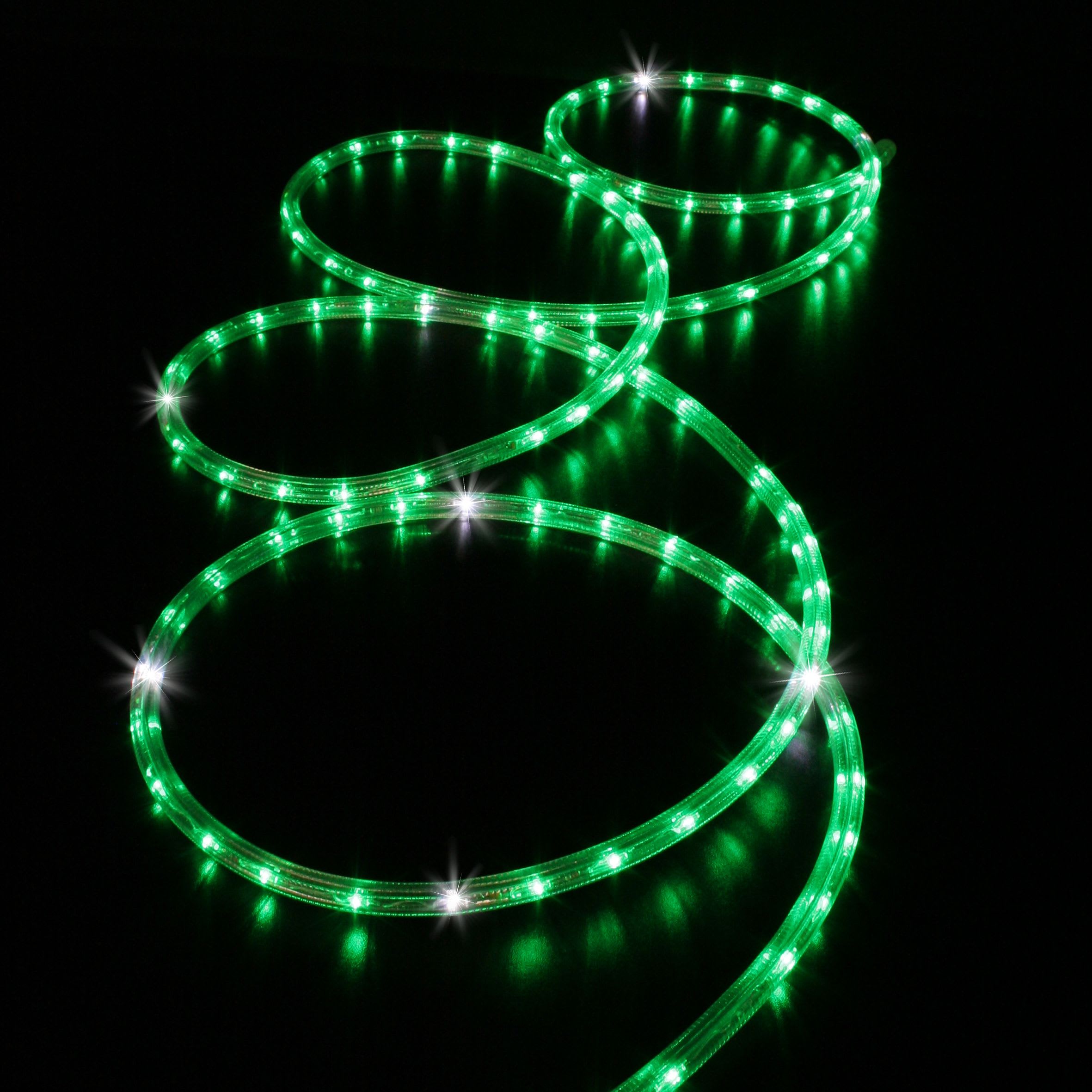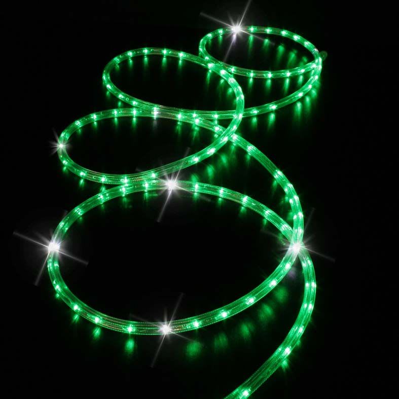 ROPE Cordon STRIP LED Vert pétillant blanc touret de 44m, ø13mm 30LED/m coupe 1m. 1/5 Led pétillant. Livré avec 3 alimentations munies de redresseurs, position horizontaledes LED pour une haute luminosité visible à 360°. Pétillement élégant, idéal pour