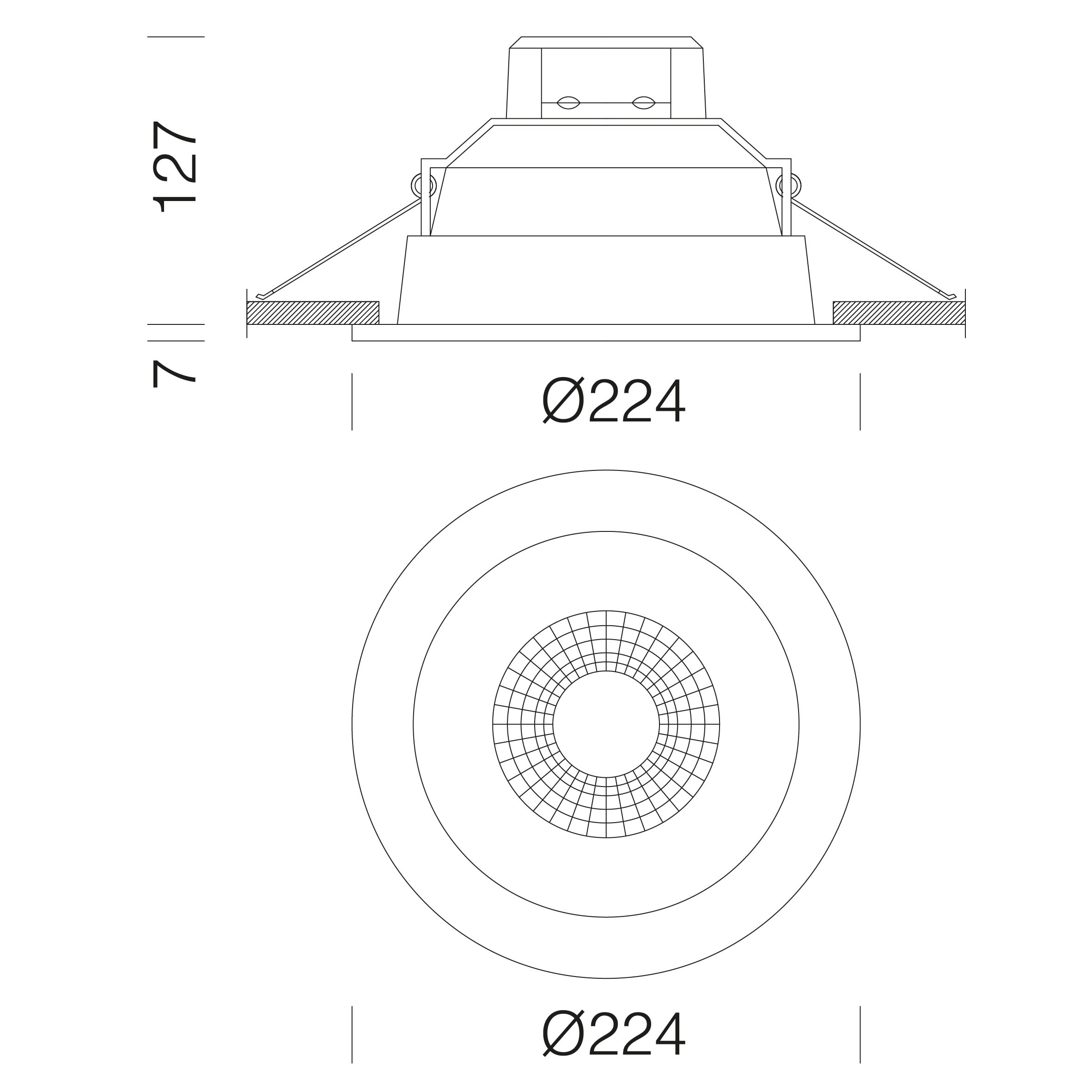 Milano Big sont parfaits pour une installation « invisible »Le corps du luminaire : • En aluminium avec logement pour ressorts de fixation au faux-plafond Réflecteur :• Un angle de 60° • En aluminium métallisé et prismatiséProduits conformes aux normes Indice de protection conforme aux normes Diamètre trou d'encastrement : min 190/ max 220mm