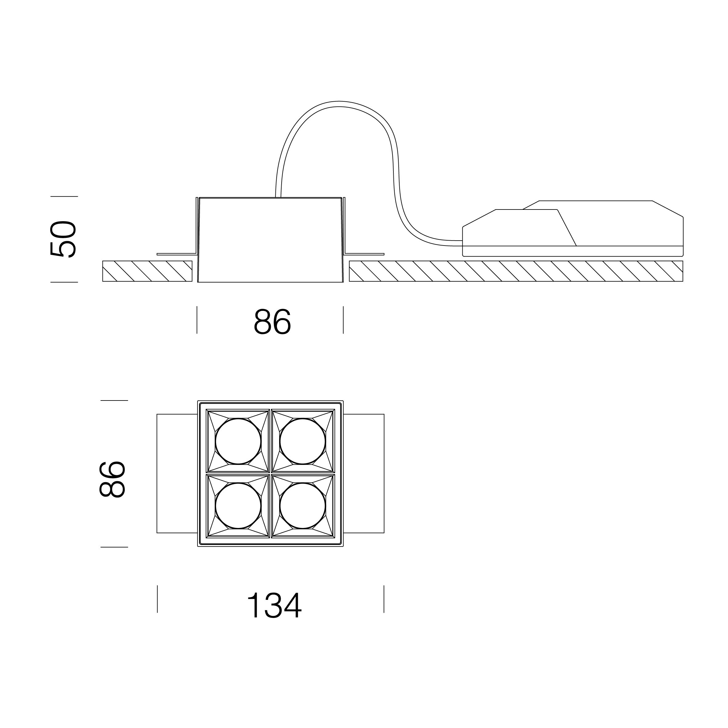 Downlights individuels LED 4 modules à encastrer, de très petites dimensions pour fusionner parfaitement avec le cadre environnant.
