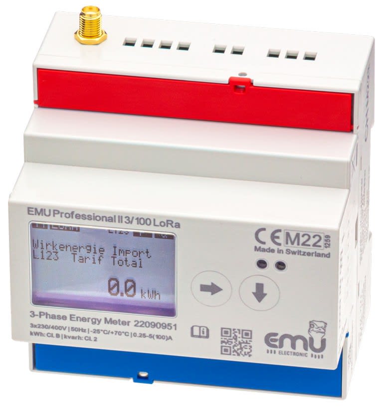 EMU Professional II 3/100 LoRa P20A000LE1 entrée traversante (pas besoin d'ajouter de TC)- LoRaWAN 868 Classe C, antenne externe- Tension: 3x230/400 V- Intensité max: 100 A- Ecran LCD 38x28- Sortie impulsionelle- Montage sur rail DIN- Certifié MID B+D et ISO50001