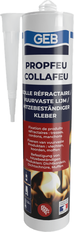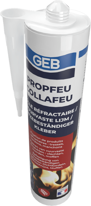 Collafeu. Colle mastic de fixation de produits réfractaires fibreux sur des pièces soumises à de fortes températures. Tenue en température : + 1100°C. Cartouche 310 ml. Couleur beige