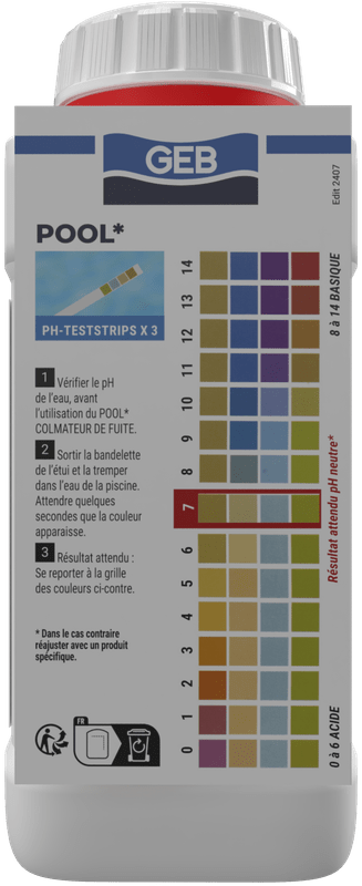 Colmate les petites fuites dans les piscines et sur les raccords de canalisations enterrées. Traite la microporosité des piscines en béton.Se verse près de la micro-fissure ou du skimmer. Baignade autorisée après 24 H. Trois tests pH offert