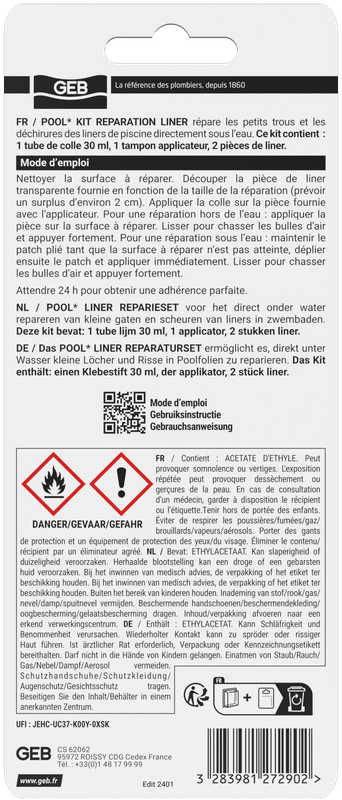 Réparation des liners et des structures gonflables, hors et sous l?eau. Réparation rapide, invisible et durable. Colle 30 ml + rustine 10 x 40 cm