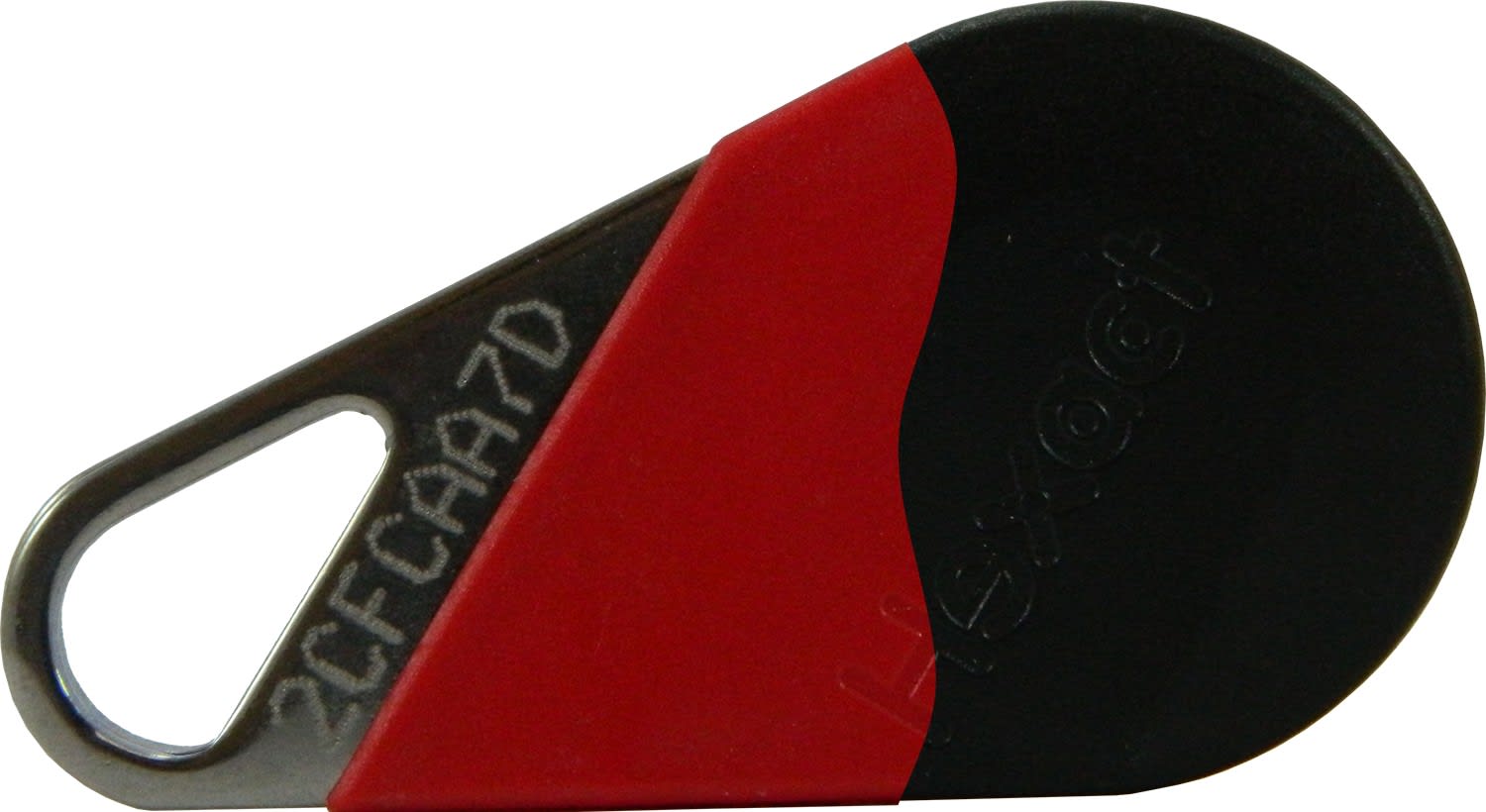 Badge de proximité • Toutes centrales HEXACT • MIFARE 13.56 MHz • Ame INOX et habillage ABS • Numéro gravé • Couleur noire/rouge