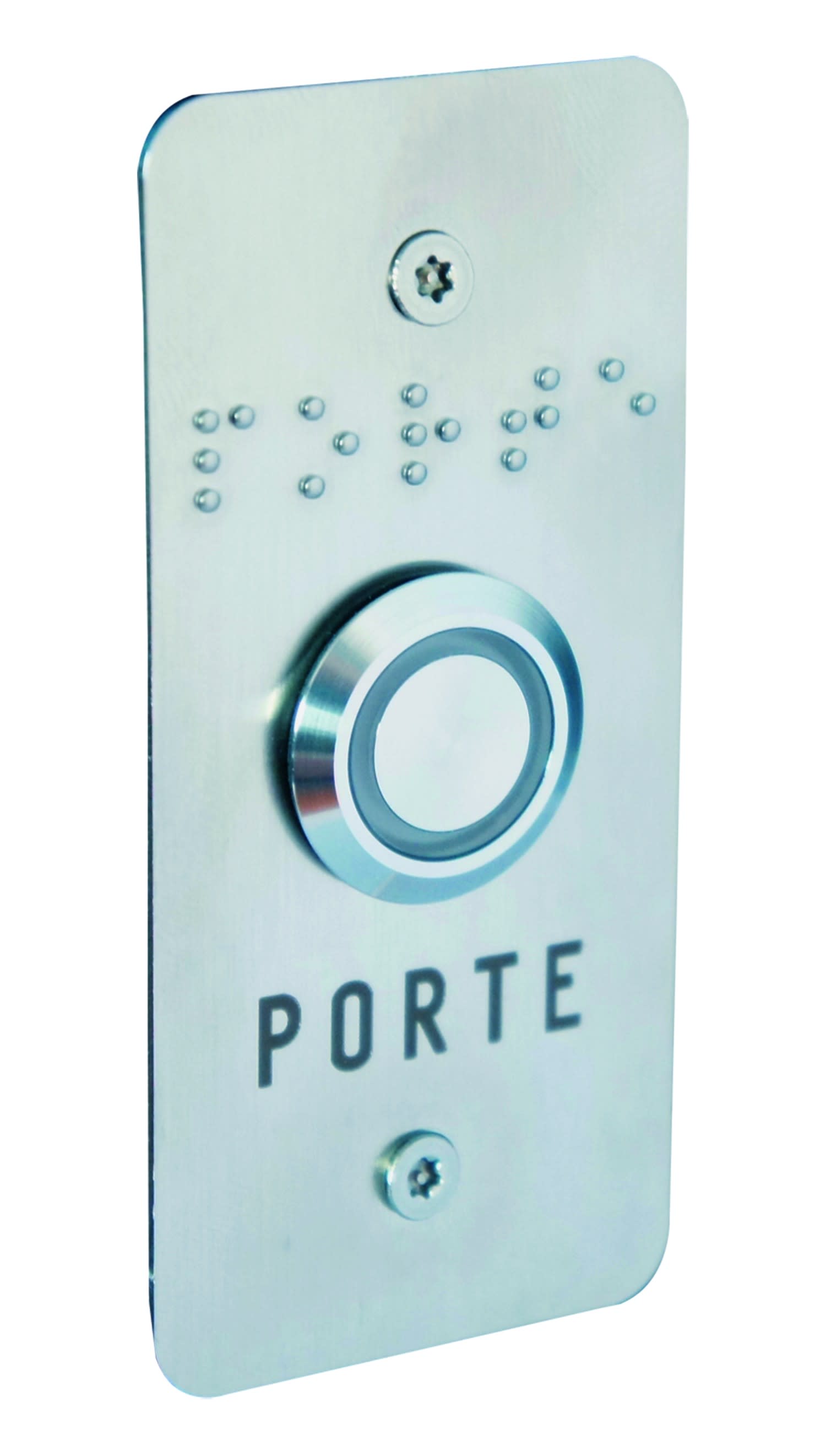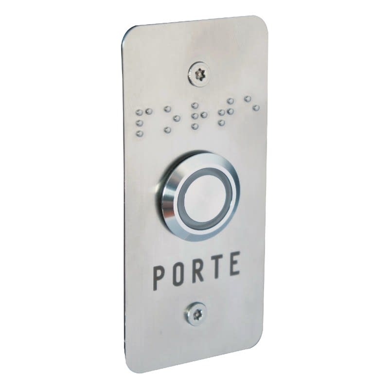Bouton de sortie éclairé à encastrer • Contact NO/NF • Marquage PORTE • Marquage BRAILLE • Façade en INOX d'épaisseur 1.5 mm • Petit modèle 40x85 mm