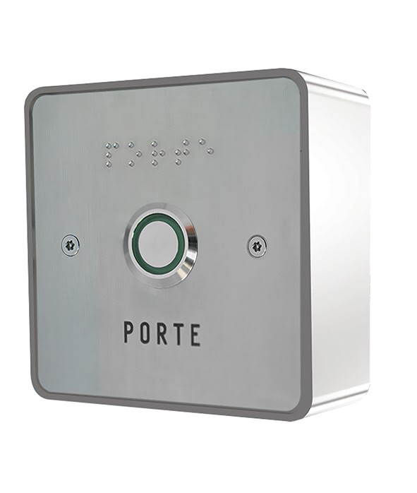 Bouton de sortie éclairé PMR saillie • Contact NO temporisé (2-80 sec) et NF • Signalisation lumineuse et sonore • Marquage PORTE • Marquage BRAILLE • Façade en INOX d'épaisseur 1.5 mm • Grand modèle 85x85 mm