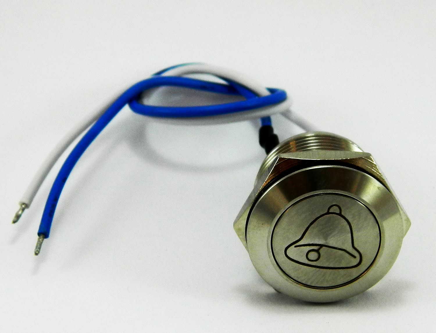 Bouton Inox normalement ouvert gravé ''Cloche'' • Livrée avec fils soudé bleu / blanc • Bouton en diamètre 19 mm • Pour platine à défilement