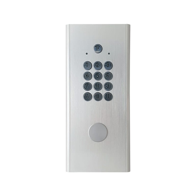 Clavier 30 codes option gestion temps réel pose encastrée • 2 relais NO/NF • Façade en Alu • Grandes touches rétro-éclairées bleu + braille • Buzzer + Led état • Alim. 12-24 Vcc/Vca
