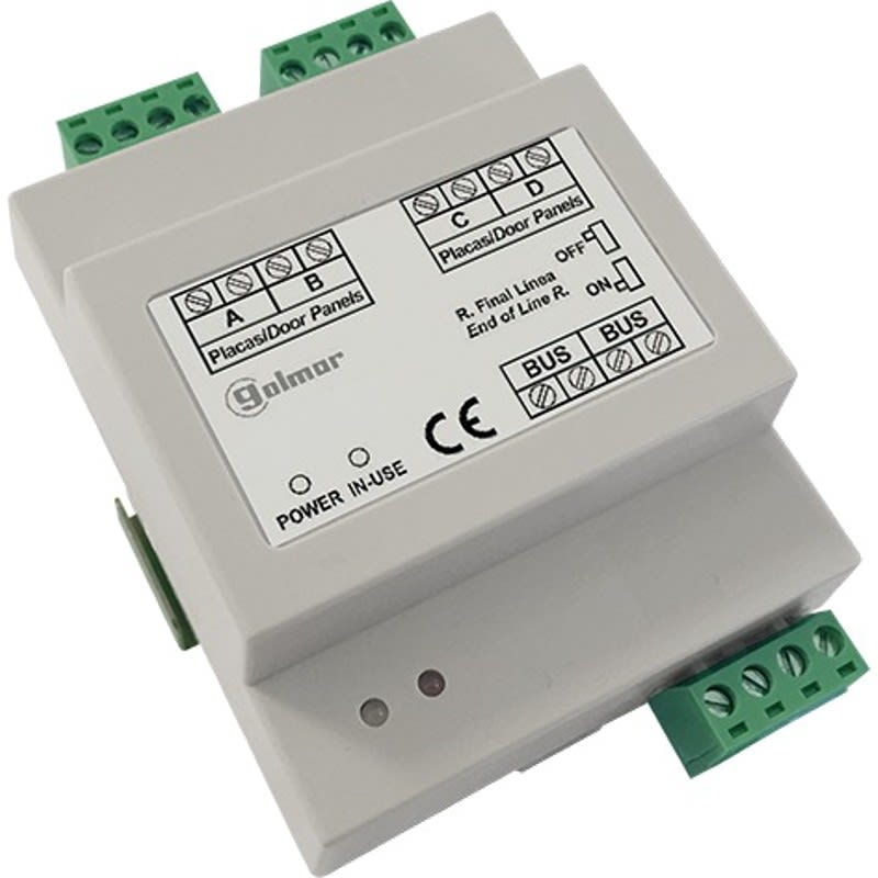 Coupleur de platines de rue et répartiteur 4 postes int. (audio/vidéo) BUS GB2 • Protection interne courts-circuits • Bornier débrochable • LED témoin d'alim. et LED présence court-circuit • Boîtier Rail DIN 4 modules