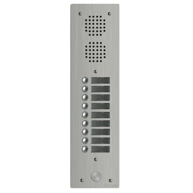 Platine HAUT-RISQUE audio analogique (1+N) • 1 rangée 10 boutons • Aluminium 5 mm d'épaisseur • Pré-percée lect. VIGIK® + cache • Vis anti-vandales Prévoir groupe audio UAV4187/002